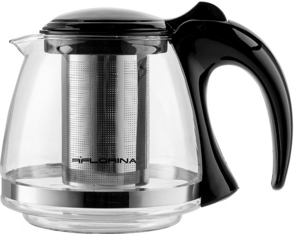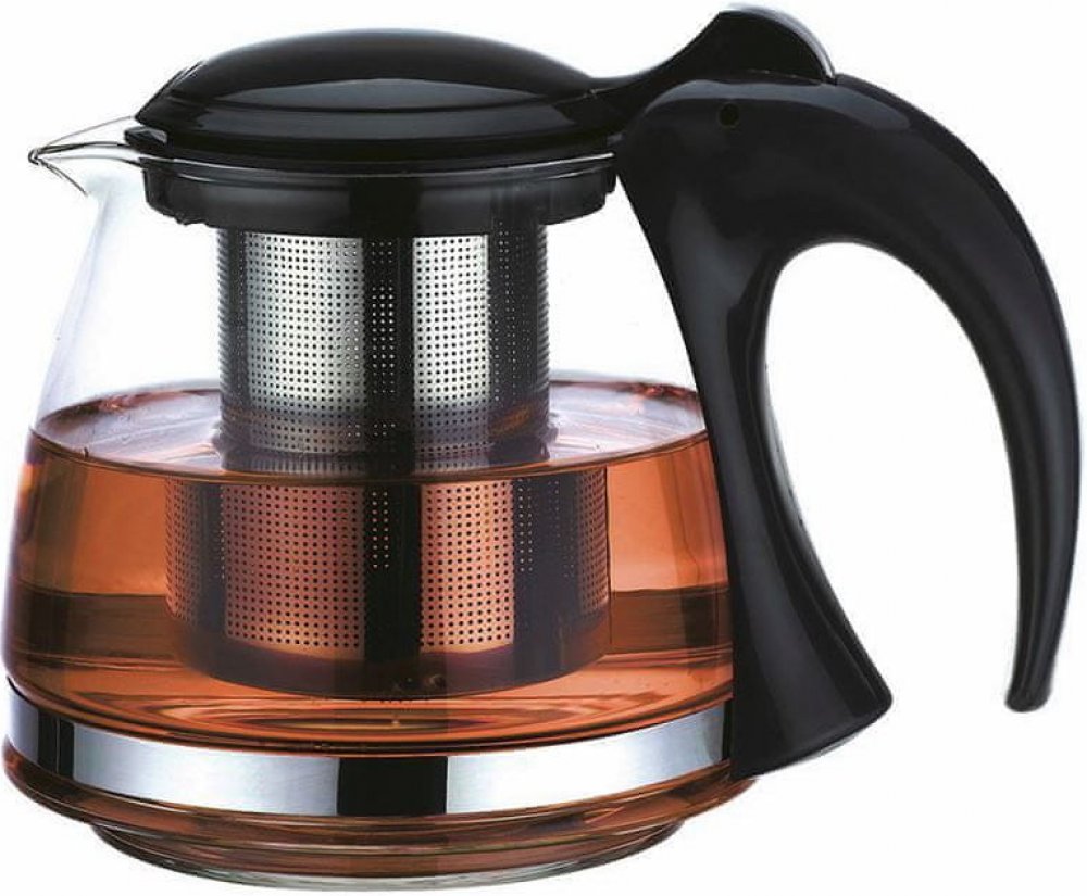 Skleněný čajník s nerezovým sítkem a plastovou ručkou.