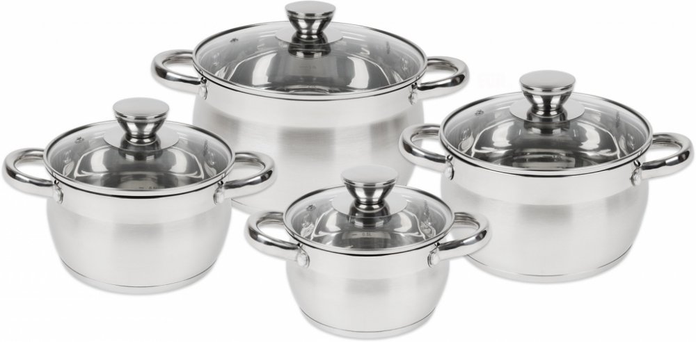 Sada nerezových hrnců Oliver 8ks. Vyrobeno z nerezové oceli o tloušťce stěny 0,4mm. Sada se skládá ze 4 hrnců s poklicí. Saténový povrch uvnitř i venku. Lze mýt v myčce. Vhodné na všechny typy sporáků včetně indukce. Rozměry hrnců: 1x průměr 8,5 cm, výška 14 cm, objem 1,25 l, 1x průměr 9,5 cm, výška 1 cm, objem 1,75 l, 1x průměr 10,5 cm, výška 18 cm, objem 2,5 l, 1x průměr 12 cm, výška 22 cm, obje...