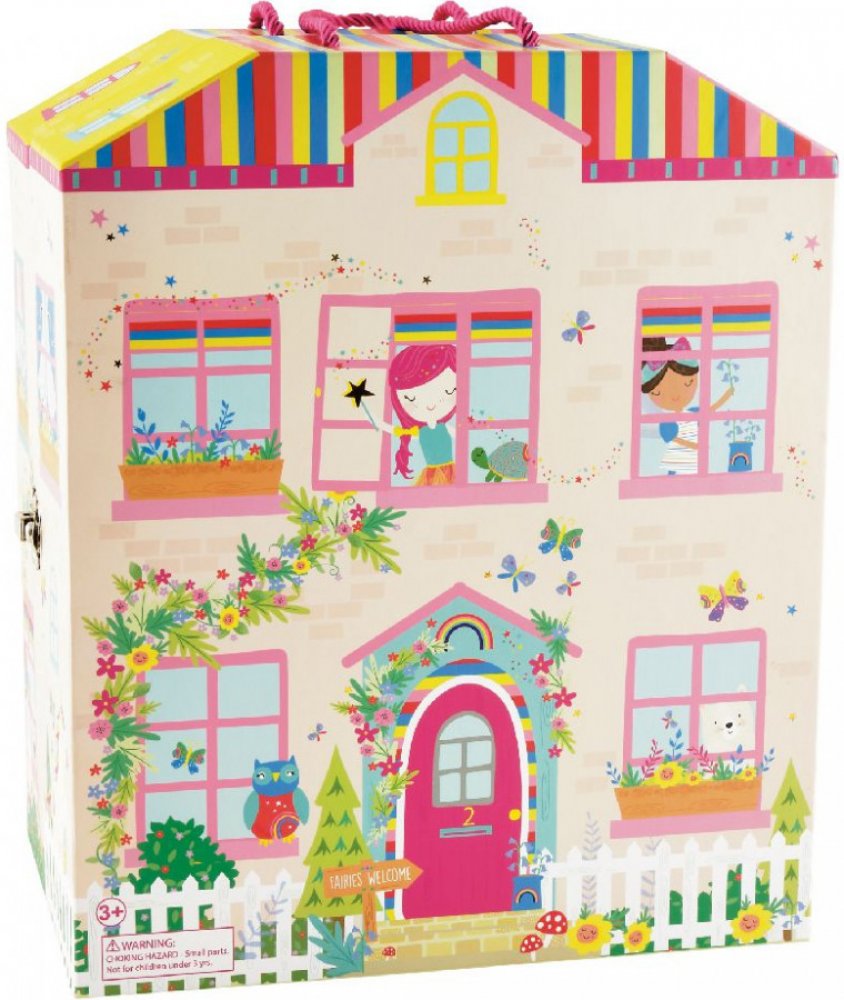 Pokud hledáte přenosný domek na hraní, je to přesně ono!!! Krásný hrací domeček s motivem duhové víly plný 18 zářivě malovaných dřevěných dílků a postaviček. Budete si chtít hrát se svými nejmenšími! Hrací box Duhová víla se dodává s bavlněným sáčkem obsahujícím 18 úžasných dřevěných oboustranných dílků. Jsou zde víly, létající jednorožci, lamy na kolečkových bruslích, medvědi tančící hula a mnoho dalšího. Domeček se otevírá a obsahuje 6 nádherných místností, které jsou všechny ručně malované. Je tu koupelna, ložnice, kuchyně, obývací pokoj. Je to tak zábavné a také barevné. Rozmístěte své postavičky po domě a popusťte uzdu své fantazii. Je plně přenosný se skvělým držadlem na přenášení, pokud se s ním chceš pochlubit a vzít ho s kamarády na společné hraní. Rozměry: 30 x 25 x 18 cm