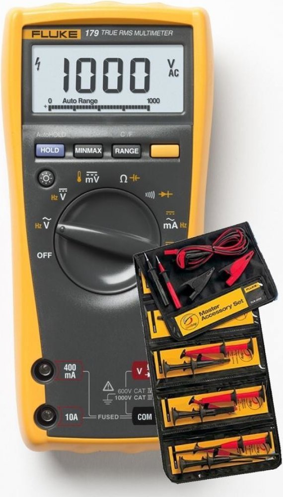 Sada obsahující multimetr Fluke 179, sadu silikonových měřicích vodičů TL224, sadu měřicího příslušenství TL910, sadu háčkových krokosvorek AC280, teplotní čidlo 80BK, magnetickou příchytku TPAK, pouzdro C35 a baterii 9 V.