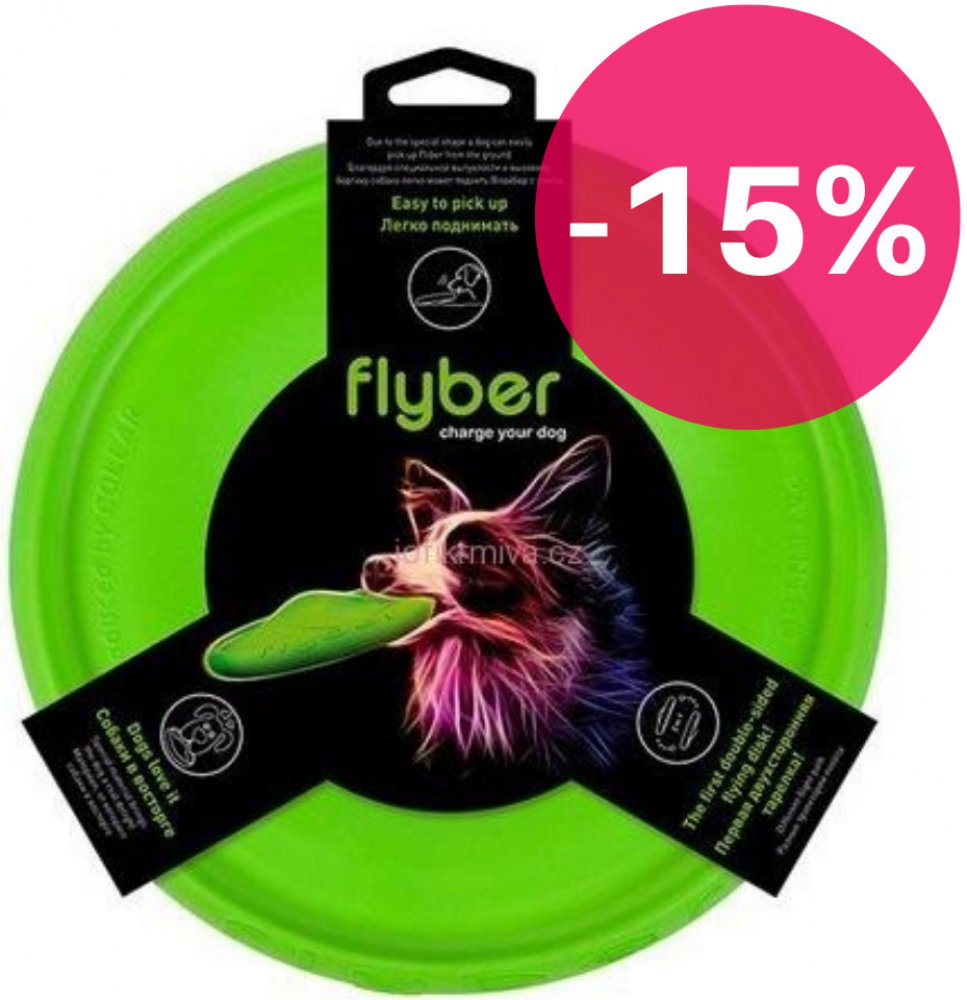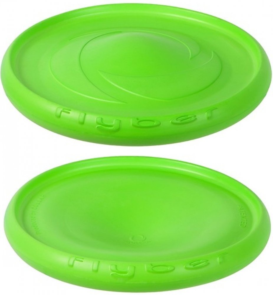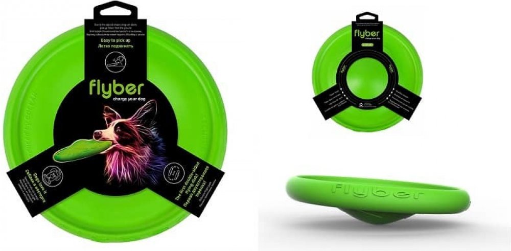 Oboustranný létající disk Flyber je vyroben z měkkého, pružného materiálu a proto je velmi jemný pro zuby a dásně. Tento materiál po čase ztratí hladký povrch, což je přirozená vlastnost materiálu. Díky své velikosti, tvaru a materiálu, do kterého se může pes narozdíl od sportovního frisbee zakousnout, je ideálním a všestranně použitelným doplňkem kolekce hraček vašeho pejska.