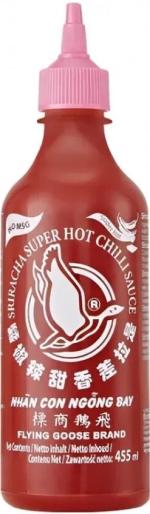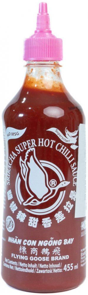 Čili omáčka Sriracha hot bez glutamátu Flying Goose Brand 455ml, Thajsko. Nejpopulárnější thajská chilli omáčka extra ostra bez glutamátu. Legendární a mimořádně oblíbená, vyhledávaná po celém světě. Taková je thajská chilli omáčka Sriracha. Obsahuje až 70% chilli. sriracha cili omack, sriracha hot chilli omáčka, thajská chilli omáčka, chilli omačka thajská ostra, Sriracha ostra paliva