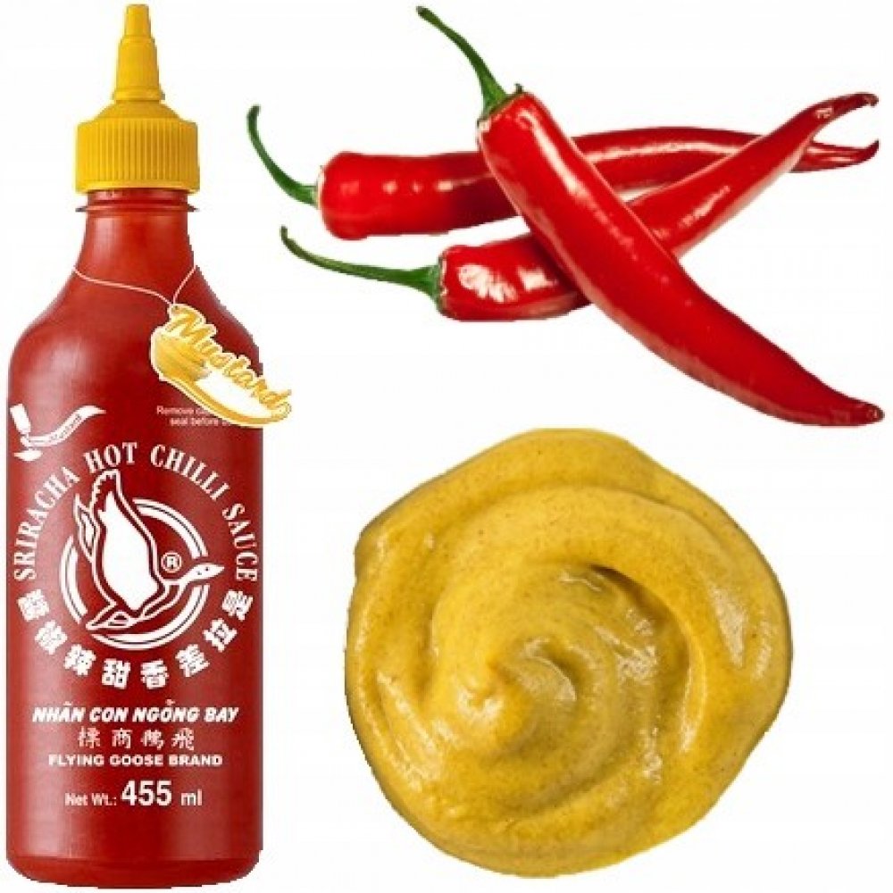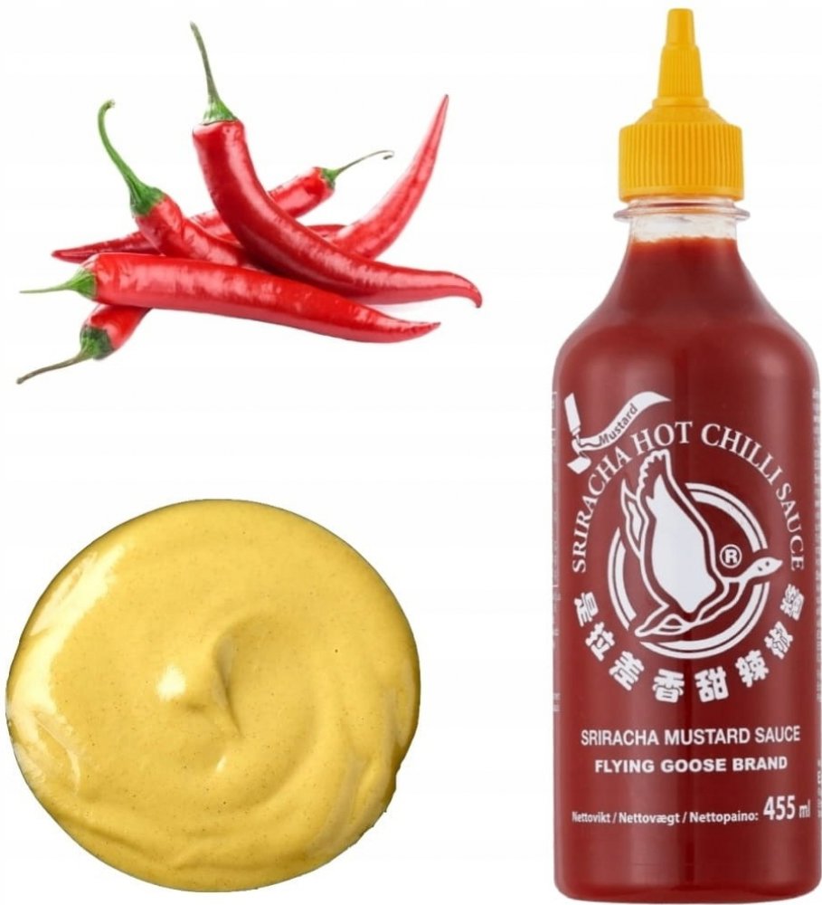 Popis: Omáčka z chilli sriracha hořčice od společnosti Flying Goose Brand v lahvičce s dávkovačem o objemu 455 ml. Velmi chutná verze sriracha omáčky s přídavkem hořčice. Je velmi ostrý, a proto dokáže uspokojit chutě milovníků opravdu ostré chuti. Je známý po celém světě pro svou vynikající, intenzivně ostrou chuť. Díky dokonalé kombinaci všech složek si získal uznání po celém světě. Omáčka je jednou z nejznámějších chilli omáček prakticky v každé zemi. Velmi často se používá v asijské kuchyni a zejména v thajské kuchyni. Thajci ho používají každý den, jako je kečup nebo majonéza.