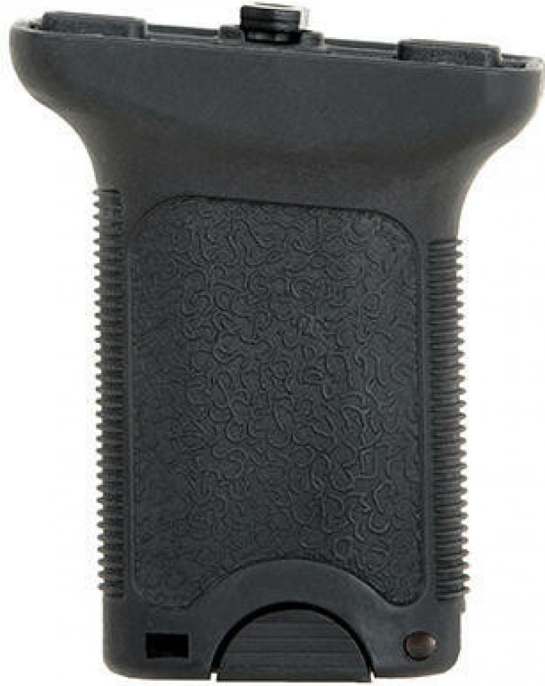 Krátká vertikální rukojeť s lehkým zkosením. Vyrobena z vysoce odolného polymeru s gumovou patkou. Díky zdrsněné textuře, ručka neklouže a pomáhá k snadnější ovladatelnosti zbraně.