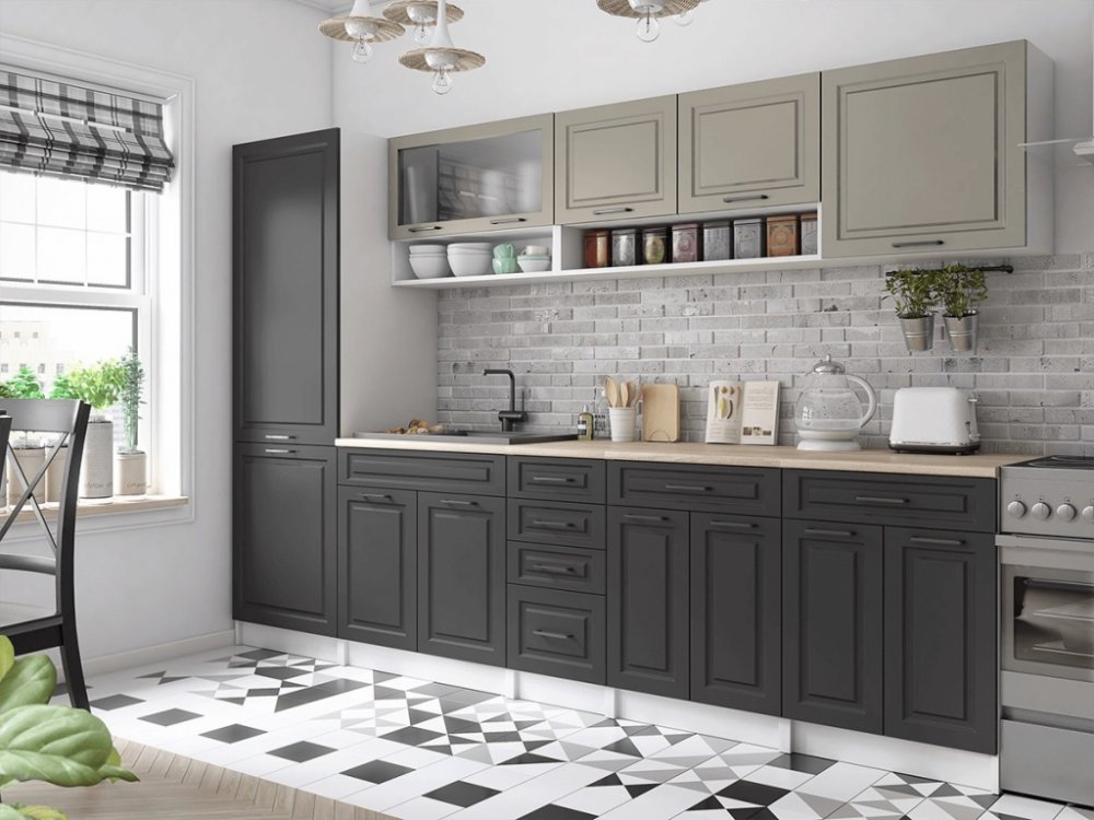 Kuchyňská linka Brigita je vyrobená ve venkovském stylu, který se hodí do kuchyně v paneláku i v rodinném domě. Tento styl má jedinečnou schopnost proměnit Vaši kuchyň v útulnou a zároveň funkční místnost, kde bude radost vařit i péct. Kuchyňská linka Brigita nabízí dostatek úložného i pracovního prostoru. Všechny skříňky jsou samostatné, takže si je můžete sestavit tak, jak Vám to vyhovuje. Korpusy skříněk jsou vyrobené z lamina 18 mm s hranami ABS a dvířka jsou MDF 16mm. Všechny skříňky jsou dodávány v demontu. Součástí balení je montážní plánek včetně všech potřebných spojovacích prvků. Cena je uvedena za sestavu vyobrazenou na úvodní fotografii BEZ PRACOVNÍ DESKY, s úchytkami, které jsou vyobrazeny v doplňkových fotografiích. Pracovní desku lze dokoupit nad každou skříňku zvlášť podle její šíře. Vyobrazené spotřebiče, dřez, baterie, doplňky a dekorace nejsou v ceně. Kuchyň bude dodaná s bílými korpusy a dvířky v kombinaci šedá a grafit.Rozměry vrchních skříněk:skříňka s výklopnými prosklenými dvířky š.80 cm, v.58 cm, hl.30 cmskříňka s výklopnými dvířky š.100 cm, v.58 cm, hl.30 cmskříňka š.60 cm, v.58 cm, hl.30 cmRozměry spodních skříněk:potravinová skříň: š.60 cm, v. 201 cm, hl.55 cmskříňka dřezová š.80 cm, v.83 cm, hl.45 cmskříňka se zásuvkami š.40 cm, v.83 cm, hl.45 cm2x skříňka se zásuvkou š.60 cm, v.83 cm, hl.45 cm