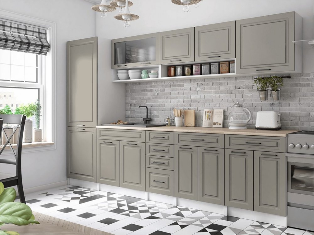 Kuchyňská linka Brigita je vyrobená ve venkovském stylu, který se hodí do kuchyně v paneláku i v rodinném domě. Tento styl má jedinečnou schopnost proměnit Vaši kuchyň v útulnou a zároveň funkční místnnost, kde bude radost vařit i péct. Kuchyňská linka Brigita nabízí dostatek úložného i pracovního prostoru. Všechny skříňky jsou samostatné, takže si je můžete sestavit tak, jak Vám to vyhovuje. Korpusy skříněk jsou vyrobené z lamina 18 mm s hranami ABS a dvířka jsou MDF 16mm. Všechny skříňky jsou dodávány v demontu. Součástí balení je montážní plánek včetně všech potřebných spojovacích prvků. Cena je uvedena za sestavu vyobrazenou na úvodní fotografii BEZ PRACOVNÍ DESKY, s úchytkami, které jsou vyobrazeny v doplňkových fotografiích. Pracovní desku lze dokoupit nad každou skříňku zvlášť podle její šíře. Vyobrazené spotřebiče, dřez, baterie, doplňky a dekorace nejsou v ceně. Kuchyň bude dodaná s bílými korpusy a šedými dvířky. Rozměry vrchních skříněk:skříňka s výklopnými prosklenými dvířky š.80 cm, v.58 cm, hl.30 cmskříňka s výklopnými dvířky š.100 cm, v.58 cm, hl.30 cmskříňka š.60 cm, v.58 cm, hl.30 cmRozměry spodních skříněk:potravinová skříň: š.60 cm, v. 201 cm, hl.55 cmskříňka dřezová š.80 cm, v.83 cm, hl.45 cmskříňka se zásuvkami š.40 cm, v.83 cm, hl.45 cm2x skříňka se zásuvkou š.60 cm, v.83 cm, hl.45 cm