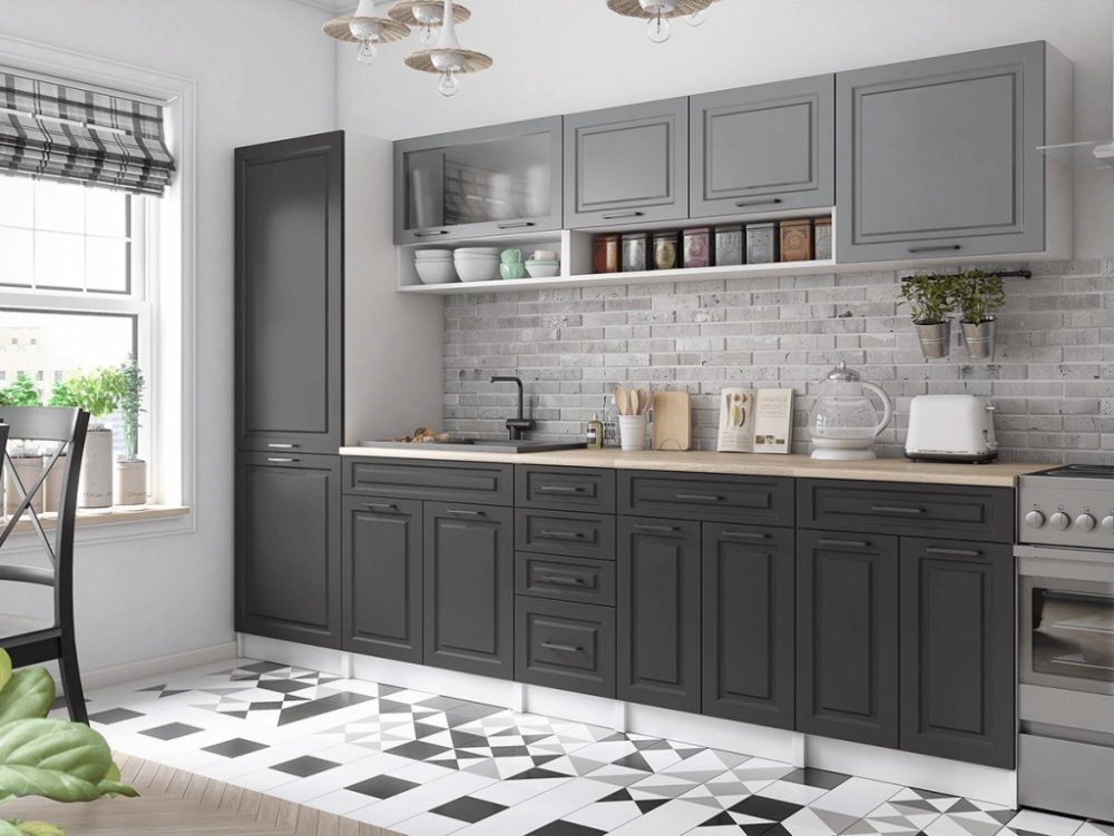 Kuchyňská linka Brigita je vyrobená ve venkovském stylu, který se hodí do kuchyně v paneláku i v rodinném domě. Tento styl má jedinečnou schopnost proměnit Vaši kuchyň v útulnou a zároveň funkční místnost, kde bude radost vařit i péct. Kuchyňská linka Brigita nabízí dostatek úložného i pracovního prostoru. Všechny skříňky jsou samostatné, takže si je můžete sestavit tak, jak Vám to vyhovuje. Korpusy skříněk jsou vyrobené z lamina 18 mm s hranami ABS a dvířka jsou MDF 16mm. Všechny skříňky jsou dodávány v demontu. Součástí balení je montážní plánek včetně všech potřebných spojovacích prvků. Cena je uvedena za sestavu vyobrazenou na úvodní fotografii BEZ PRACOVNÍ DESKY, s úchytkami, které jsou vyobrazeny v doplňkových fotografiích. Pracovní desku lze dokoupit nad každou skříňku zvlášť podle její šíře. Vyobrazené spotřebiče, dřez, baterie, doplňky a dekorace nejsou v ceně. Kuchyň bude dodaná s bílými korpusy a dvířky v šedém a grafit odstínu. Rozměry vrchních skříněk:skříňka s výklopnými prosklenými dvířky š.80 cm, v.58 cm, hl.30 cmskříňka s výklopnými dvířky š.100 cm, v.58 cm, hl.30 cmskříňka š.60 cm, v.58 cm, hl.30 cmRozměry spodních skříněk:potravinová skříň: š.60 cm, v. 201 cm, hl.55 cmskříňka dřezová š.80 cm, v.83 cm, hl.45 cmskříňka se zásuvkami š.40 cm, v.83 cm, hl.45 cm2x skříňka se zásuvkou š.60 cm, v.83 cm, hl.45 cm