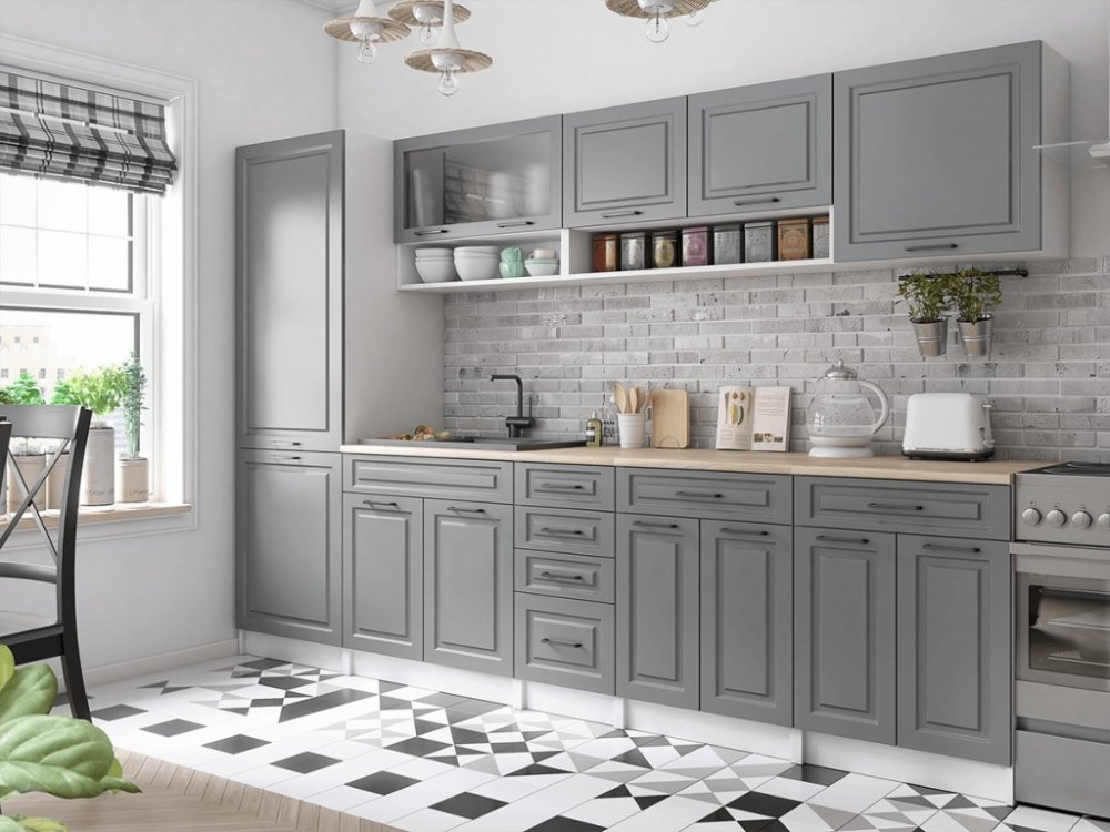 Kuchyňská linka Brigita je vyrobená ve venkovském stylu, který se hodí do kuchyně v paneláku i v rodinném domě. Tento styl má jedinečnou schopnost proměnit Vaši kuchyň v útulnou a zároveň funkční místnost, kde bude radost vařit i péct. Kuchyňská linka Brigita nabízí dostatek úložného i pracovního prostoru. Všechny skříňky jsou samostatné, takže si je můžete sestavit tak, jak Vám to vyhovuje. Korpusy skříněk jsou vyrobené z lamina 18 mm s hranami ABS a dvířka jsou MDF 16mm. Všechny skříňky jsou dodávány v demontu. Součástí balení je montážní plánek včetně všech potřebných spojovacích prvků. Cena je uvedena za sestavu vyobrazenou na úvodní fotografii BEZ PRACOVNÍ DESKY, s úchytkami, které jsou vyobrazeny v doplňkových fotografiích. Pracovní desku lze dokoupit nad každou skříňku zvlášť podle její šíře. Vyobrazené spotřebiče, dřez, baterie, doplňky a dekorace nejsou v ceně. Kuchyň bude dodaná s bílými korpusy a dvířky v šedé barvě. Rozměry vrchních skříněk:skříňka s výklopnými prosklenými dvířky š.80 cm, v.58 cm, hl.30 cmskříňka s výklopnými dvířky š.100 cm, v.58 cm, hl.30 cmskříňka š.60 cm, v.58 cm, hl.30 cmRozměry spodních skříněk:potravinová skříň: š.60 cm, v. 201 cm, hl.55 cmskříňka dřezová š.80 cm, v.83 cm, hl.45 cmskříňka se zásuvkami š.40 cm, v.83 cm, hl.45 cm2x skříňka se zásuvkou š.60 cm, v.83 cm, hl.45 cm