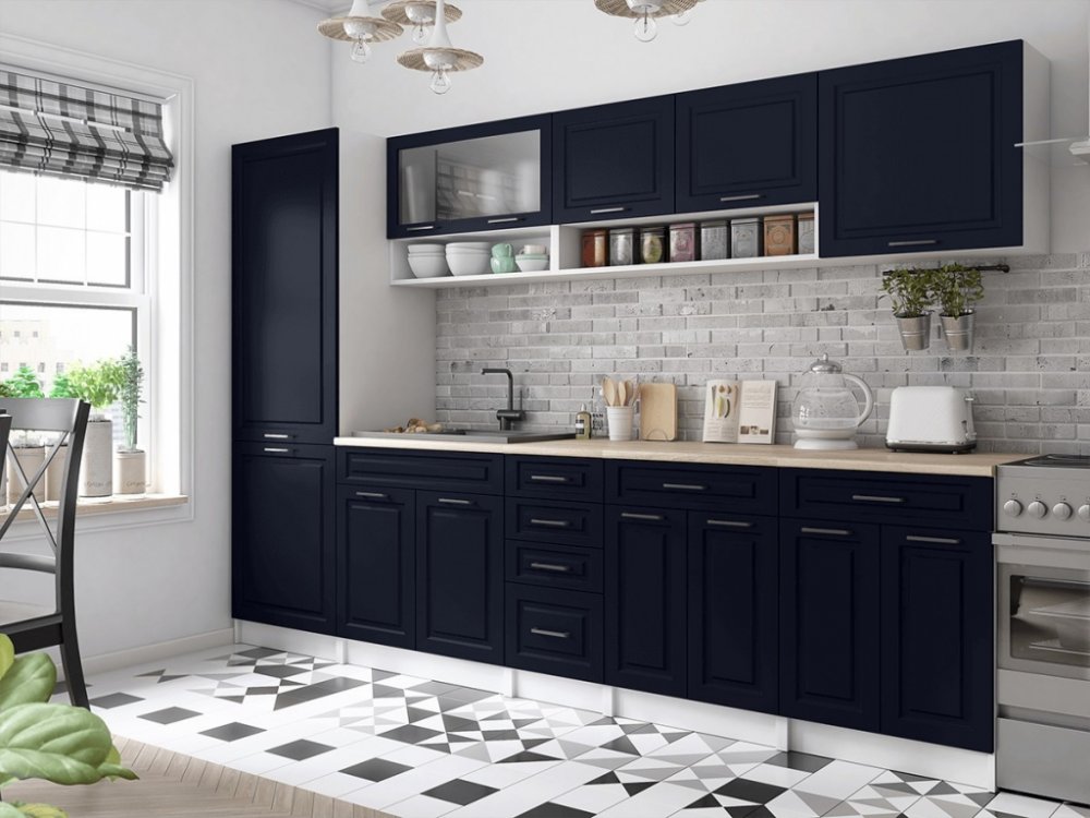 Kuchyňská linka Brigita je vyrobená ve venkovském stylu, který se hodí do kuchyně v paneláku i v rodinném domě. Tento styl má jedinečnou schopnost proměnit Vaši kuchyň v útulnou a zároveň funkční místnost, kde bude radost vařit i péct. Kuchyňská linka Brigita nabízí dostatek úložného i pracovního prostoru. Všechny skříňky jsou samostatné, takže si je můžete sestavit tak, jak Vám to vyhovuje. Korpusy skříněk jsou vyrobené z lamina 18 mm s hranami ABS a dvířka jsou MDF 16mm. Všechny skříňky jsou dodávány v demontu. Součástí balení je montážní plánek včetně všech potřebných spojovacích prvků. Cena je uvedena za sestavu vyobrazenou na úvodní fotografii BEZ PRACOVNÍ DESKY, s úchytkami, které jsou vyobrazeny v doplňkových fotografiích. Pracovní desku lze dokoupit nad každou skříňku zvlášť podle její šíře. Vyobrazené spotřebiče, dřez, baterie, doplňky a dekorace nejsou v ceně. Kuchyň bude dodaná s bílými korpusy a dvířky ve tmavě modré barvě.Rozměry vrchních skříněk:skříňka s výklopnými prosklenými dvířky š.80 cm, v.58 cm, hl.30 cmskříňka s výklopnými dvířky š.100 cm, v.58 cm, hl.30 cmskříňka š.60 cm, v.58 cm, hl.30 cmRozměry spodních skříněk:potravinová skříň: š.60 cm, v. 201 cm, hl.55 cmskříňka dřezová š.80 cm, v.83 cm, hl.45 cmskříňka se zásuvkami š.40 cm, v.83 cm, hl.45 cm2x skříňka se zásuvkou š.60 cm, v.83 cm, hl.45 cm