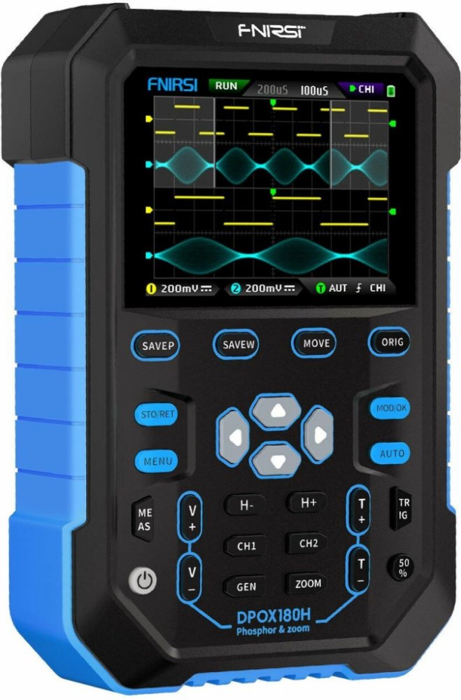Digitální osciloskop s generátorem signálu FNIRSI DPOX180H se šířkou pásma 180MHz a vzorkovací frekvencí 500MS/s a dvěmi kanály. Integrovaný generátor signálu DDS.2,8" IPS full-vision displej s vysokým rozlišením a vestavěná lithiová baterie 4,2V/3000mAh.Technické parametry: -počet kanálů: 2- analogová šířka pásma: 180MHz- maximální vzorkovací frekvence v reálném čase: 500 ms/s- čas náběhu: 2,5 ns...