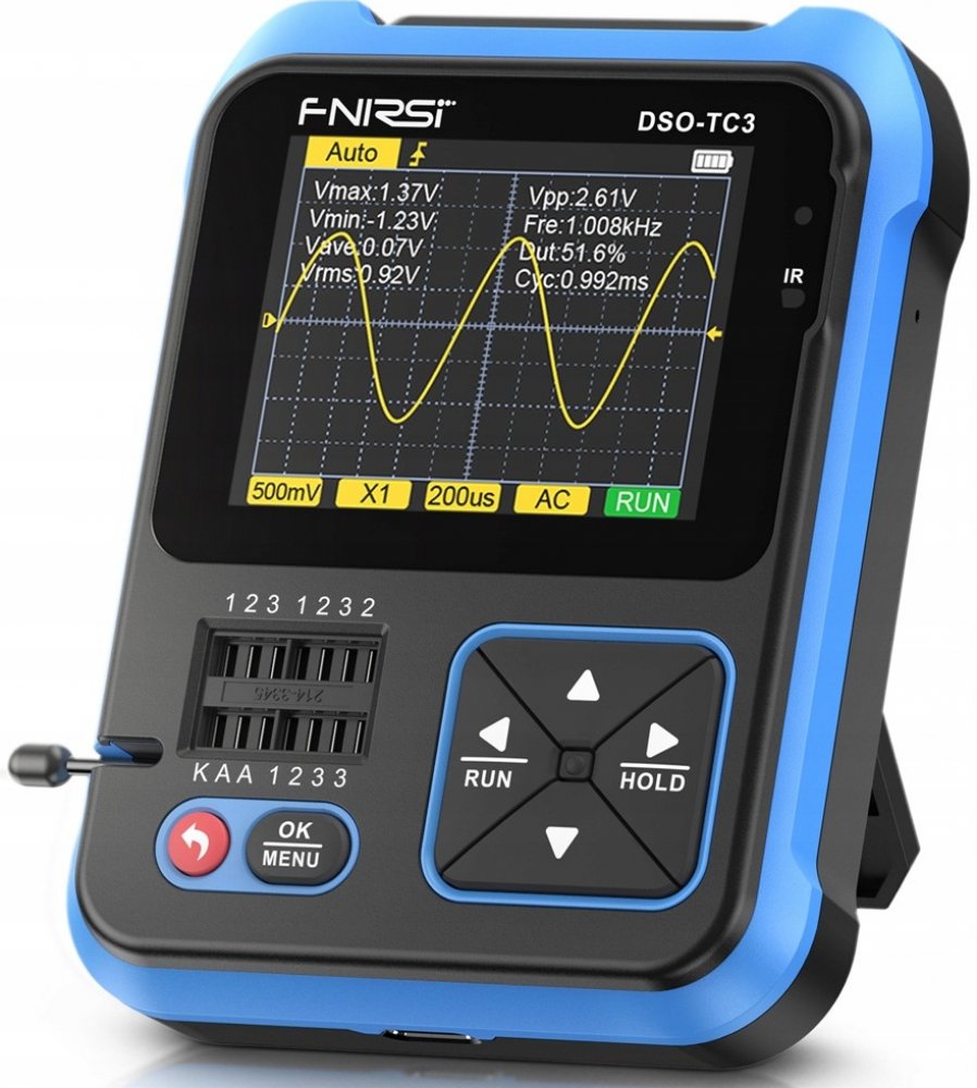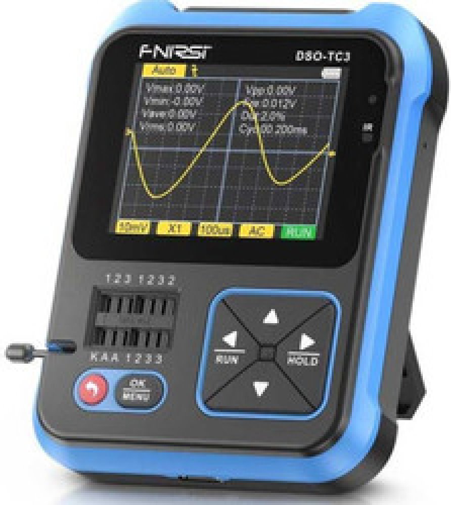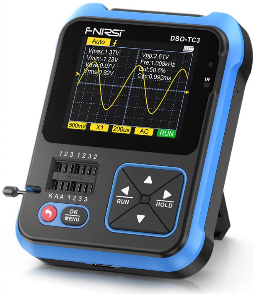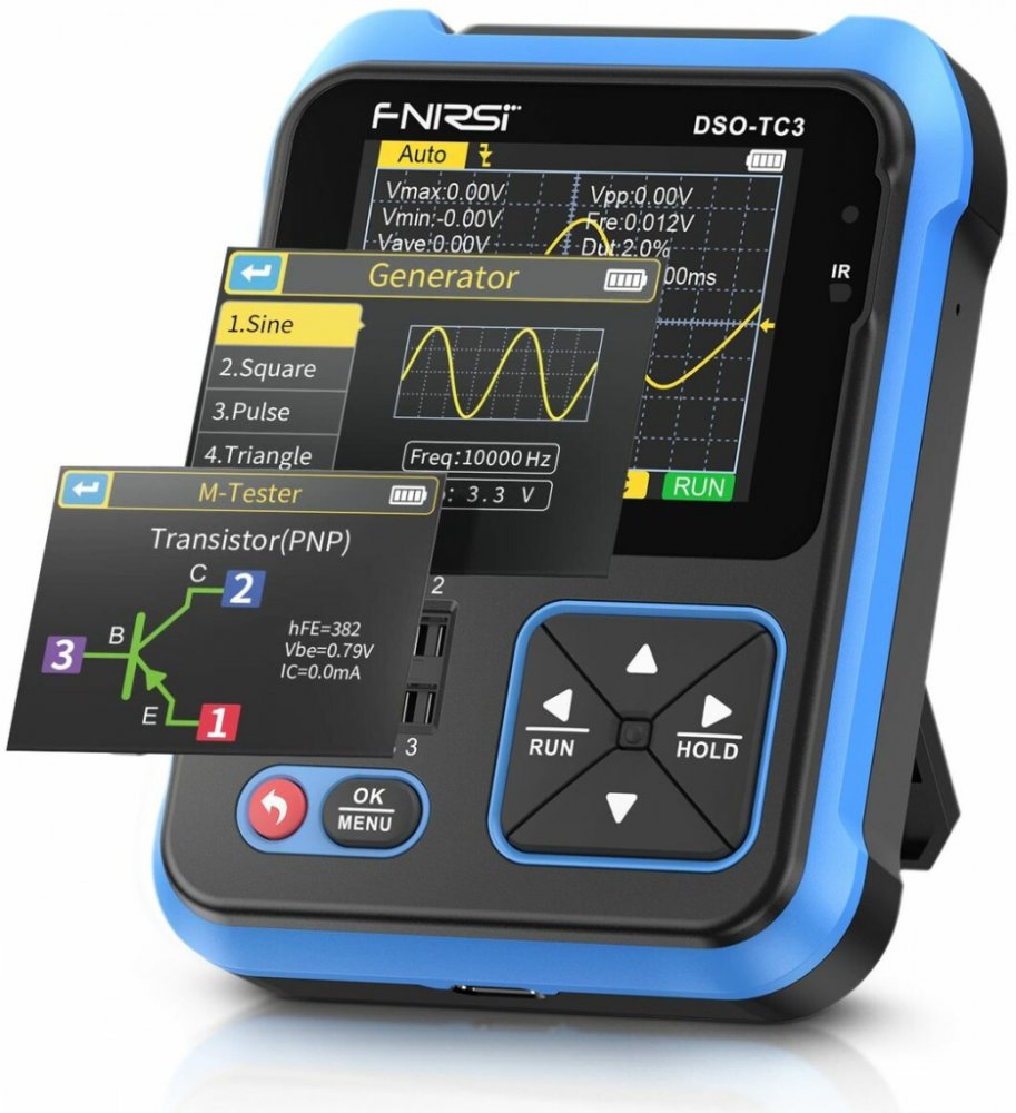 Osciloskop 500kHz, generátor funkcí a tester součástek FNIRSI DSO-TC3, je kompaktní digitální osciloskop s několika funkcemi: Ruční osciloskop: DSO-TC3 má vzorkovací frekvenci v reálném čase 10MS/s a šířku pásma 500 kHz. Díky kompletním funkcím spouštění (jednoduché, normální, automatické) lze libovolně používat periodické analogové signály i neperiodické digitální signály. Je vybaven výkonným tlačítkem AUTO, které umožňuje zobrazovat průběhy měření bez zdlouhavého nastavování. Tester tranzistorů: Funkce testeru tranzistorů umožňuje automaticky identifikovat a měřit různé tranzistory, včetn