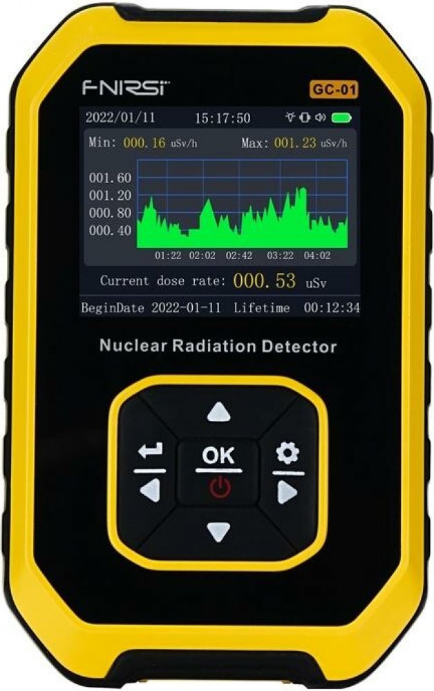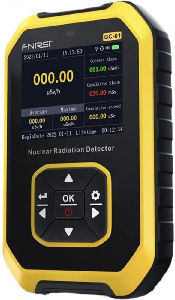 Detektor radiace, dozimetr FNIRSI GC-01 FNIRSI GC-01 je profesionální detektor radioaktivního záření. Detektor je schopen detekovat a měřit ionizující záření z různých zdrojů, jako např. gama záření nebo beta částice. Dokáže detekovat nadměrné hodnoty i ve stavu spánku. Jeho vysoká citlivost umožňuje detekci i velmi nízkých úrovní záření, zatímco přesné měření zajišťuje spolehlivost v různých situacích. S jednoduchýma intuitivním rozhraním je snadno ovladatelný i pro nezkušené uživatele. Detektor je vybavený velkým barevným LCD displejem s možností podsvícení při zhoršených viditelných podmín
