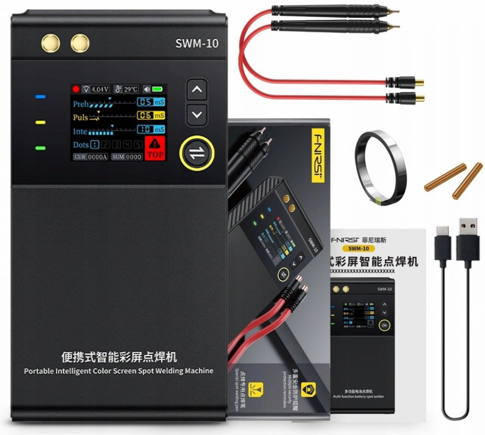 Bodová svářečka baterií FNIRSI SWM-10.Fnirsi SWM-10 je přenosná ruční bodová svářečka primárně určená pro sváření kontaktů na bateriích. Díky technologii bodového svařování s dvojitým impulsem poskytuje stabilní a odolné spoje. Svařuje nikl, železo, hliník a nerezovou ocel. S maximálním svařovacím proudem až 1200A a tloušťkou svařování 0,25 mm je tato svářečka vysoce efektivní.Barevný TFT LCD displej s úhlopříčkou 1,8 palce umožňuje čtení a nastavování parametrů. Displej zobrazuje napětí a teplotu akumulátoru, délku a počet pulsů a mnoho dalších důležitých informací. Velkou výhodou Fnirsi SWM-10 je možnost použití jako powerbanku, a to dokonce s funkcí rychlonabíjení.Svářečka je vybavená inteligentním senzorem kontroly teploty a ochranou proti přehřátí, nízkému napětí a zkratu.Technické parametry: - velikost displeje: 1,8palce- typ displeje: TFT LCD- kapacita baterie: 5000 mAh- nabíjecí konektor: USB-C- nabíjecí napětí: 5V / 2.1A- max. nabíjecí proud: 1200A- délka kabelů s elektrodami: cca 33cm- tloušťka svařovaného materiálu: 0,1 – 0,25mmObsah balení: 1× Bodová svářečka 2× Držák pro svařování 1× Niklový plech 2× Náhradní hrot 2× USB kabel