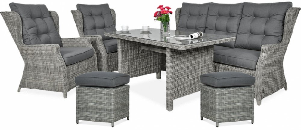 PopisObjevte neobyčejnou harmonii mezi moderním designem a funkčností s jedinečnou soupravou nábytku Trivento Dining 3 Stone Grey se 2 pufy. Naše exkluzivní souprava se skládá z 3místné pohovky, 2 křesel, 2 pufů a stylového stolu a vytváří dokonalé prostředí pro nezapomenutelná setkání nebo venkovní večírky Nábytek vyrobený z odolného technorattanu vyzařuje eleganci a sofistikovanost. Jejich kamenně šedá barva dokonale ladí s okolím a dodá vaší zahradě, terase nebo balkonu jedinečné kouzlo. Nábytek je navíc odolný vůči povětrnostním vlivům, což z něj činí ideální volbu pro venkovní prostory a zároveň zajišťuje, že se snadno udržuje v bezvadné čistotě. Prioritou jídelní soupravy Trivento Dining 3 Stone Grey je pohodlí při používání. Sedáky a opěradla jsou polstrovány měkkými polštáři odolnými proti deformaci a poskytují vynikající oporu při odpočinku venku. Moderní styl nábytku dokonale ladí s různými zahradními úpravami a vytváří jedinečné místo k odpočinku. Jídelní souprava Trivento 3 Stone Grey bude dobře fungovat nejen jako relaxační prostor, ale také jako elegantní jídelní místo. Velký stůl s elegantní skleněnou deskou zaručuje stabilitu a dostatek prostoru pro vše, co potřebujete při setkání s blízkými Zařiďte si prostor s ohledem na pohodlí a estetiku a vyberte si náš exkluzivní zahradní nábytekv barvě Stone Grey. Najděte rovnováhu mezi moderním designem a funkčností a vytvořte nezapomenutelné a luxusní chvíle v přírodě. Vlastnosti výrobku Souprava je určena pro venkovní i vnitřní použití sada obsahuje funkční 3místnou pohovku, 2 pufy, 2 křesla a velký obdélníkový stůl rám je vyroben z práškově lakovaného hliníku, který zajišťuje stabilitu a lehkost konstrukce a naprostou odolnost proti korozi na povrchovou úpravu je použit nejkvalitnější technorattan kamenné šedi. extra pohodlí zajišťují silné a pohodlné polštáře se zipy stůl je vybaven 5 mm silnou tabulí z tvrzeného bezpečnostního skla celá souprava se velmi snadno udržuje v čistotě, k čištění stačí pouze vlhký hadřík. díky použití vysoce kvalitních materiálů (technorattan, hliník) se naše souprava vyznačuje maximální trvanlivostí, odolností vůči povětrnostním podmínkám a UV záření. senzační pro zahradu, terasu a všechny obytné prostory.Rozměry stůl: délka - 140 cm, šířka - 80 cm, výška - 65 cm křeslo: š - 73 cm, hl - 85 cm, v - 100 cm pohovka: šířka - 187 cm, hloubka - 85 cm, výška - 100 cmpuf: šířka - 40 cm, hloubka - 40 cm, výška - 40 cm, výška s polštářem - 48 cm