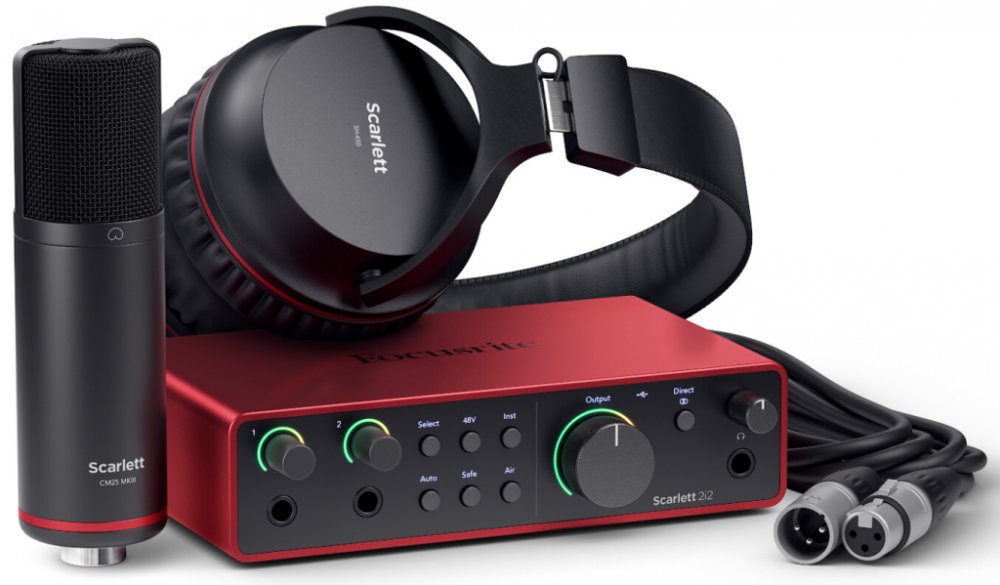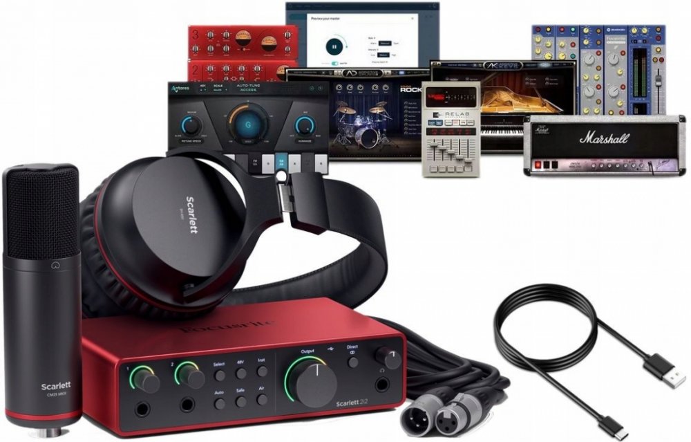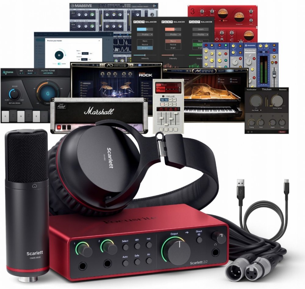 USB zvuková karta Focusrite Scarlett 2i2 Studio 4th Gen je kompletní záznamový balíček pro sólové hudebníky a producenty, který nabízeí výkonnou kombinaci audio rozhraní, mikrofonu a sluchátek. Čtvrtá generace Scarlett rozhraní přináší vylepšený zvuk a ovladače, což zajišťuje křišťálově čisté nahrávky bez latence. Součástí balíčku je kardioidní kondenzátorový mikrofon, ideální pro zpěváky a hudebníky, který zachytí každý detail s dokonalou čistotou. Přiložená uzavřená sluchátka pak poskytnou bohatý basový zvuk a izolaci, což je nezbytné jednak pro nahrávání, tak i pro monitoring nahrávky v reálném čase. Focusrite Scarlett se právem řadí mezi nejúspěšnější a nejprodávanější řadu audio rozhraní na světě. Již od první generace přináší skvělý zvuk a stabilní ovladače za velmi příznivou cenu a není tedy divu, že na zvukových kartách s charakteristickým šasi z červeného leštěného hliníku vyrostla celá nová generace producentů a nejedno domácí či nízkorozpočtové studio. Během více než dekády vývoje se tak zvukovky Scarlett staly synonymem pro nejvyšší kvalitu v rámci nižší i střední třídy a jsou skvělou vstupní branou pro kvalitní nahrávání. Jaká je tedy čtvrtá generace Focusrite Scarlett? Samozřejmě, že nejlepší! V poslední revizi řady Scarlett došlo k mnoha významným vylepšením, a to především po zvukové stránce. Nové převodníky s topologií RedNet přináší do řady Scarlett špičkovou konverzi s rozlišením 24 bit a podporu nejvyšší samplovací frekvence 192 kHz, čímž je dosaženo dynamického rozsahu 120 dB. Inovace se dočkal i sluchátkový výstup, který na Scarlett niky nezněl lépe. Inovované mikrofonní předzesilovače poskytnou až 69 dB čistého zesílení, takže patřičně vybudíte i nejnáročnější dynamické či páskové mikrofony bez nutnosti externího preampu. Přepracovaná oblíbená funkce Air přináší střípek zvuku ikonických mixpultů Studio Console s režimem Presence, který zesiluje vysoké frekvence vašeho signálu, ideální pro vytváření intimních vokálních nahrávek, zachycení každého drobného detailu akustické kytary a třpytivých bicích overheadů. Nový obvod Harmonic Drive pro změnu cílí na posílení harmonických frekvencí středního pásma, což je skvělé třeba pro elektrické kytary. Funkce Auto Gain, Clip Safe a Dynamic Halo vám pomohou se správným nastavení předzesilovače. Dynamic Halo je jednoduchým řešením, jak indikovat přebuzení signálu. Pokud je podsvícení červené, snižte gain tak, aby barva byla zelená. U většiny modelů (kromě Scarlett Solo a Solo Studio) můžete využít tlačítka Auto pro automatické nastavení zisku, stačí jen zazpívat pár frází nebo zahrát na nástroj a jste připraveni na nahrávání. V kombinaci s aktivovanou funkcí Safe se vám prostě nemůže stát, že by záznam na vstupu byl přebuzený. Nechybí virtuální mixážní konzole Focusrite Control 2 díky které nastavíte zisk přímo z prostředí vašeho počítače nebo využijete nastavení šikovné funkce Loopback. Ke každému audio rozhraní Scarlett dostanete DAW Ableton Live Lite a Avid Complete Plugin Bundle, Melodyne Essential pro doladění a editaci vokálů, nástrojů nebo bicích, Softube Flow Guitar Essential obsahující kolekci dvou aparátů, tří efektů a kytarových signálových řetězců, Addictive Drums, Relab Reverb a samozřejmě porci kvalitních pluginů přímo od Focusrite. Všem uživatelům je dostupná časově neomezená licence špičkového DAW Pro Tools Intro+. Focusrite Scarlett 2i2 4th Generation je dvoukanálové USB-C audio rozhraní, které nabízí dva mikrofonní předzesilovače nebo dva vstupy pro linkové a nástrojové signály, jeden stereo výstup pro připojení poslechových monitorů a jeden sluchátkový výstup.