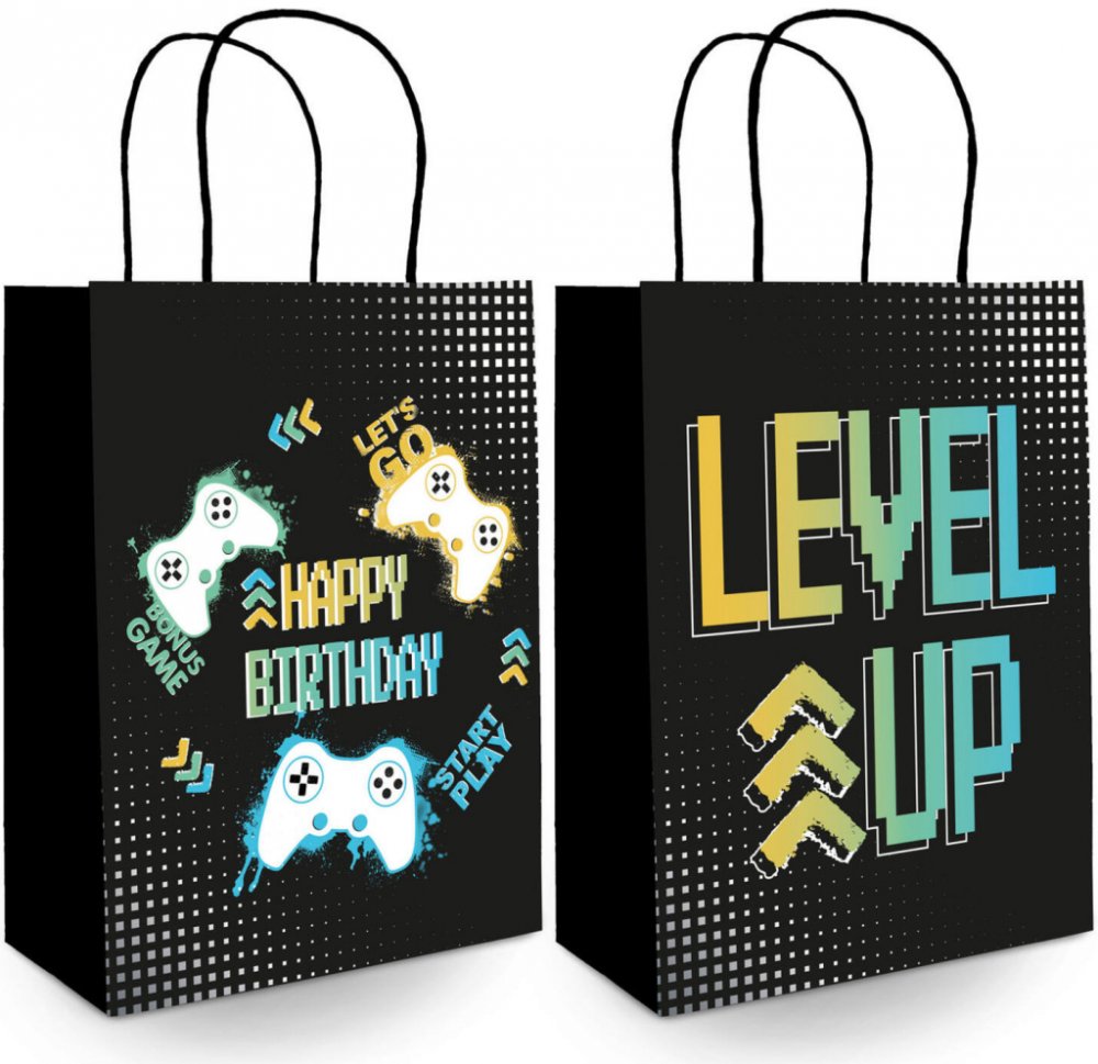 Dárková papírová taška Level Up Game Party je pohodlný a rychlý způsob, jak zabalit dárek oslavenci na tématické herní párty.
