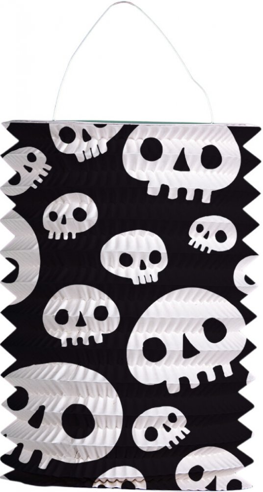 Papírový lampion Lebky v černé barvě s bílým potiskem, velikost 16 cm.