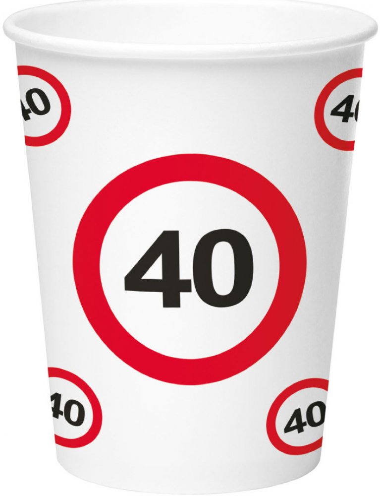 Papírové kelímky červeno-bílé s černým číslem 40 ve stylu dopravních značek, objem 250 ml, v balení 8 ks.