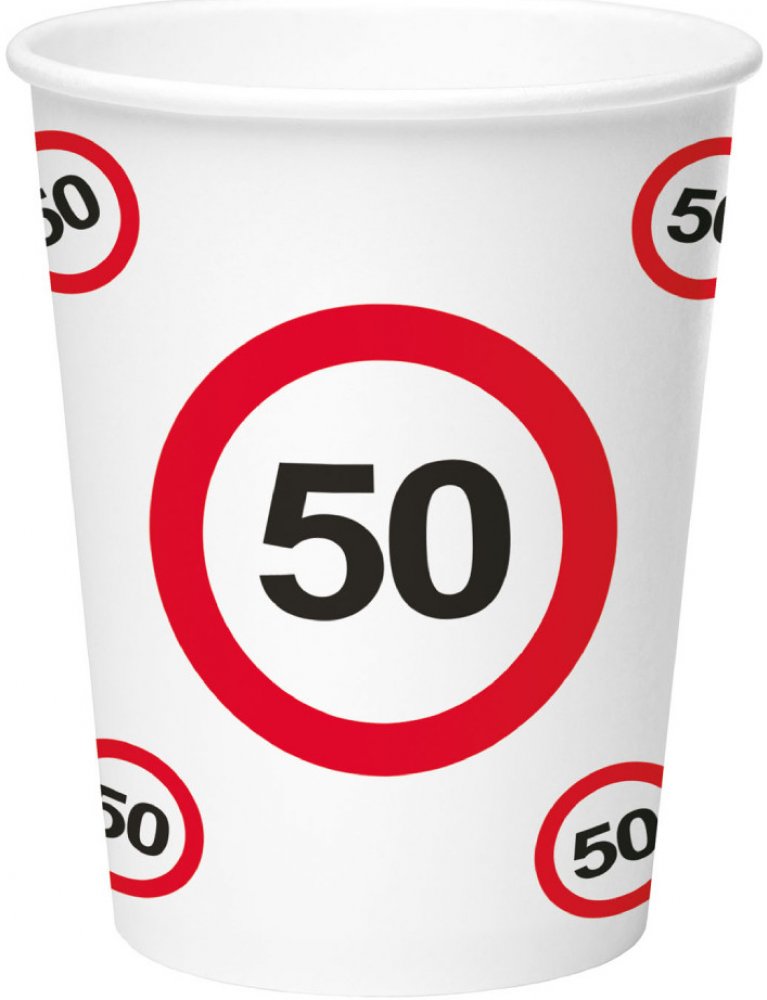 Papírové kelímky červeno-bílé s černým číslem 50 ve stylu dopravních značek, objem 250 ml, v balení 8 ks.