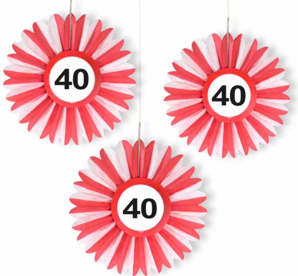 Závěsné dekorace papírové mini rozety v červeno-bílé barvě s černým číslem 40 ve stylu dopravní značky, výška 21,5 cm, velikost rozety 12,5 cm, v balení 3 ks.