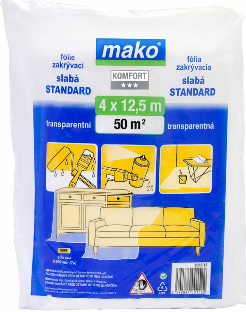 Zakrývací 7mikronová fólie spolehlivě ochrání před barvou, prachem, špínou, vlhkostí a dalším znečištěním. Je určena pro lakýrníky, malíře, stavební firmy a domácnost. Fólie zakryje plochu o rozměru až 50 m2. Barva čirá. Cena za ks.