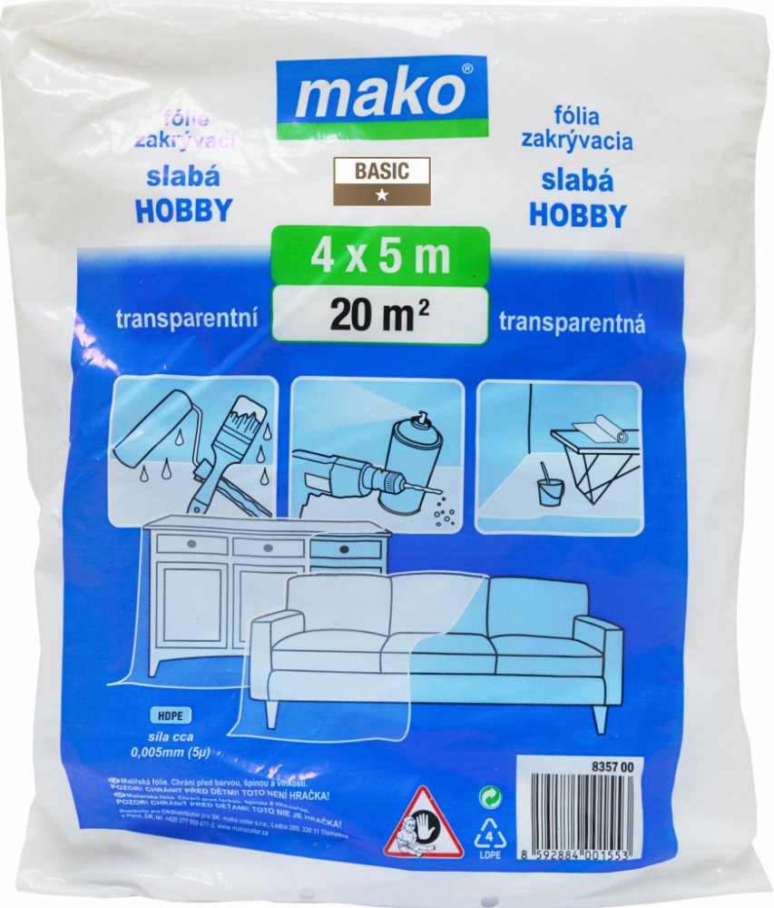 Zakrývací 5mikronová fólie spolehlivě ochrání před barvou, prachem, špínou, vlhkostí a dalším znečištěním. Je určena pro lakýrníky, malíře, stavební firmy a domácnost. Fólie zakryje plochu o rozměru až 20 m2. Barva čirá. Cena za ks.