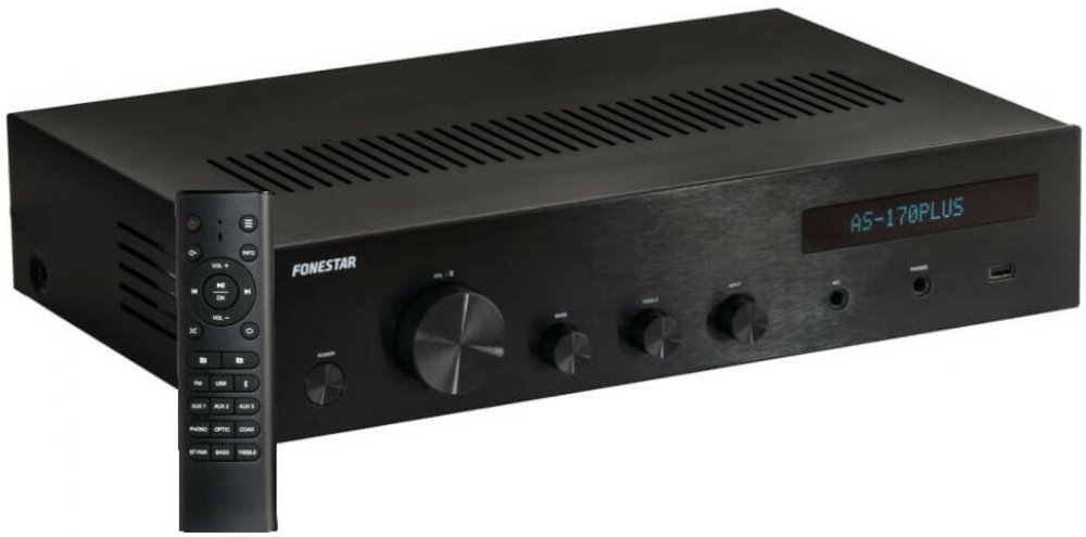 Hi-Fi stereo zesilovač s Bluetooth, vstupem USB pro přehrávání MP3, FM rádiem a digitálními vstupy pro připojení například TV Fonestar AS-170PLUS.