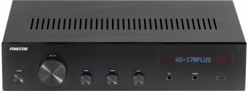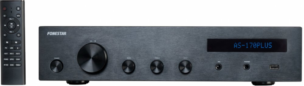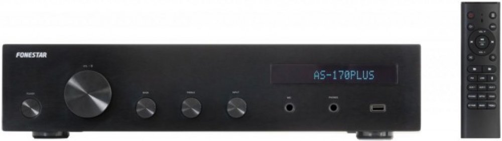 Na základě dlouholetých zkušeností vytvořil Fonestar zesilovač s těmi nejlepšími funkcemi a jedinečným, všestranným a elegantním designem. Čistá a moderní estetika s elegantním povrchem, který je ideální pro jakýkoli prostor. Mějte vaši hudbu vždy k dispozici s vestavěným přehrávačem, který zahrnuje Bluetooth přijímač, USB/MP3 přehrávač a FM rádio. Nabídka nastavení umožňuje zasilovač upravit tak, aby vyhovoval každé příležitosti. Poskytuje zvuk ve dvou zónách díky volitelnému výstupu pro připojení dvou párů reproduktorů (A/B). Vestavěný přehrávač a mnoho zvukových vstupů (včetně gramofonu) činí tento zesilovač velmi univerzálním a přizpůsobitelným pro všechny druhy aplikací. Skvělý výkon a výjimečný zvuk pro vaši hudbu. Hi-Fi zesilovač AS-170PLUS je ideální pro domácí i profesionální použití, doma, v barech, hospodách, restauracích, obchodech, školách atd.