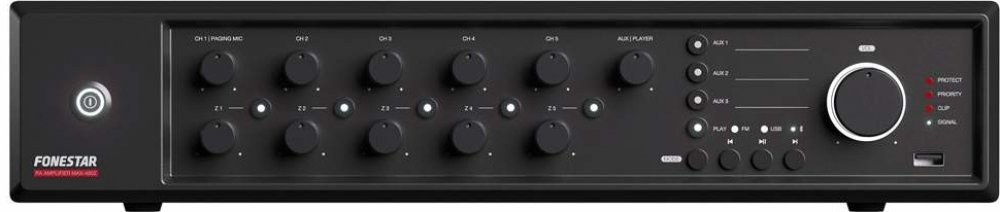 5-zónový zosilňovač triedy D pre 100V rozvody. Obsahuje 5x univerzálne symetrické vstupy (euroblock a combo konektor XLR/jack6,3mm) s prepínačom MIC/Line/fantóm +48V/Chime/VOX (vstup CH1 má paging), 3x stereo nesymetrický AUX vstup (2x RCA), 1x EMC vstup pre 100V (euroblock), remote MUTE a AMP IN (RCA). Fantómové napájanie na vstupoch 1-5 má 48V DC. Výstupy: 1x REC (2x RCA), 1x PRE OUT (RCA), 100V, 70V, 4ohm, 5x 100V. Obsahuje samostatnú reguláciu citlivosti a hlasitosti vstupov a výstupných zón a 2-pásmové korekcie. Zosilňovač má vstavaný USB/MP3 prehrávač s Bluetooth a FM tunerom. Prehrávanie MP3 sa spustí automaticky po zapnutí zosilňovača. Zosilňovač má zabodovanú ochranu proti prebudeniu vstupného signálu a proti prehriatiu s teplotne riadeným ventilátorom. Zosilňovač je určený aj na montáž do 19" RACKu.Napájanie: 230/115 V ACHarmonické skreslenie: < 0,5%Vstupy:5x symetrické MIC/LINE, (XLR/jack6.3mm, euroblock) 600Ω 5,6mV a 100000Ω 250mV, prepínateľné. 3x AUX, (2x RCA) 47000Ω 316mV.1x EMC 100V (euroblock).1x MUTE kontakty na diaľkové utlmenie zvuku1x AMP IN 1,2V RMS1x RJ45 pre zónový mikrofón ZONEMIC6 (max. vzdialenosť 200m)Výstupy:1x Linkový REC výstup, (2x RCA) 316mV1x Linkový PRE OUT výstup, (RCA) 1,2V1x 100V, 70V, 4ohm pre bezzonove zapojenie5x 100V pre zonove zapojenie1x výstup s 24V spínaním pre regulátory s núdzovým odposluchom