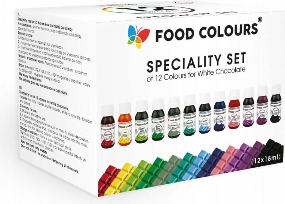 Sada 12 tekutých barviv od společnosti Food Colours je ideálním řešením pro všechny milovníky čokolády a pečiva, kteří chtějí svým sladkým kreacím dodat jedinečný charakter. Díky široké škále intenzivních barev vytvoříte skutečná cukrářská umělecká díla, která potěší chuťové buňky i oko.
