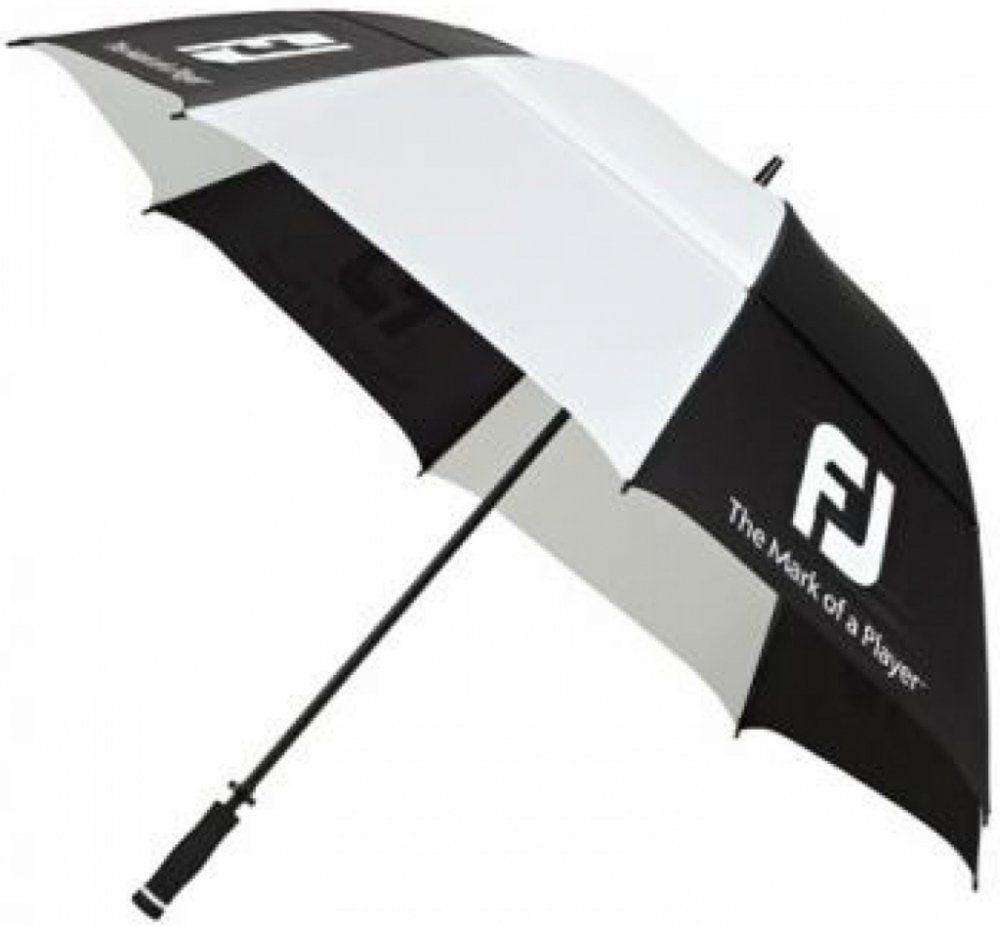 Veliký golfový deštník DryJoys Double Canopy s logem FootJoy má dvojí potah aby se zabránilo obrácení deštníku při velkém větru, také vás a váš bag spolehlivě ochrání proti dešti a slunci. Rukojeť je klasicky tvarovaná.