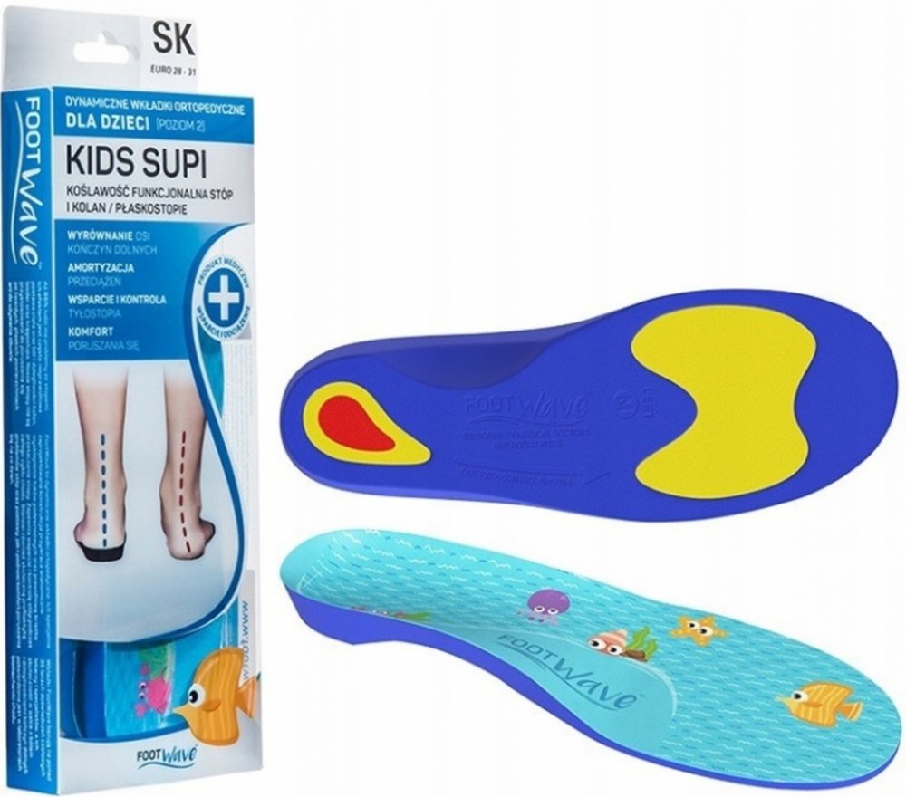 Stélky FootWave KIDS SUPI 3/4 jsou stélky určené pro děti, které mají "křivé" nohy nebo kolena nebo ploché nohy. Unikátní konstrukce dynamické plochy pro uložení chodidla FootWave pomáhá snižovat bolest nohou dítěte, zejména pat a zároveň významně zvyšuje stabilitu a pohodlí při pohybu.