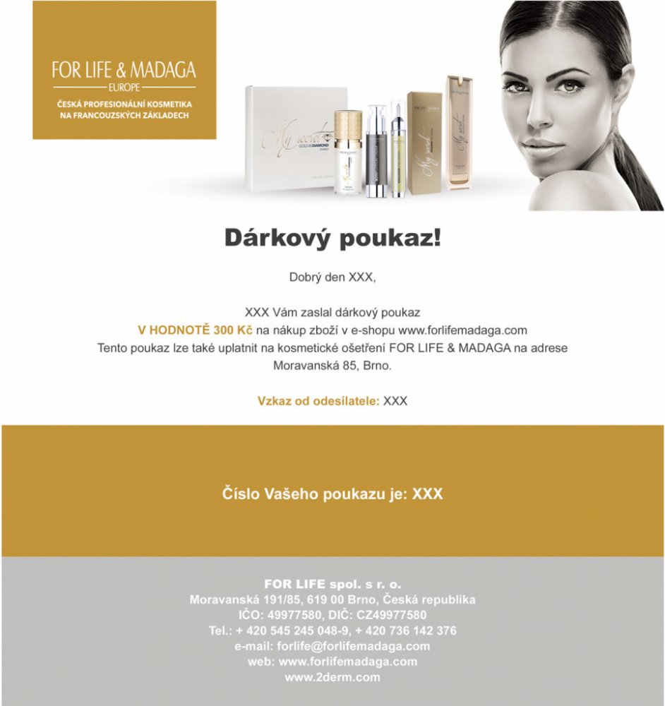 Poukaz v emailovém formátu. Lze jej uplatnit na nákup zboží nebo kosmetické ošetření v salonu FOR LIFE & MADAGA Moravanská 85, Brno. Platnost 1 rok.