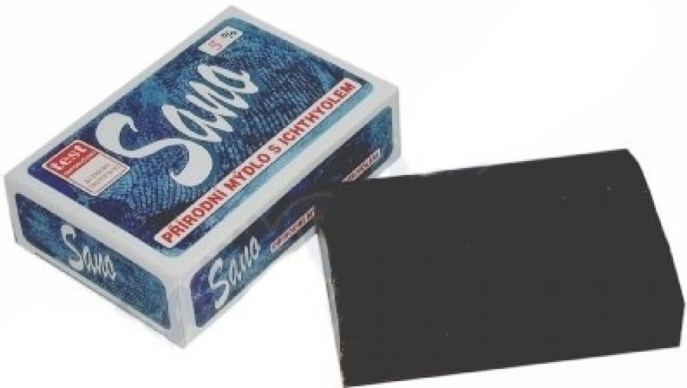 rostředek pro hygienu těla. Přírodní mýdlo s ichtyolem. V současnosti jsou dehtová mýdla nahrazována přípravky s účinnou složkou ichtamol. Ichtamol (ammonium bituminosulfát) je směs amonamonných solí sulfonových kyselin, obsahující zhruba 10% organicky vázané síry. Synonymum ichtyol je odvozen od zbytků zkamenělin ryb přítomných ve výchozí břidlicové surovině. Z ostatních bituminózních dehtů se do...