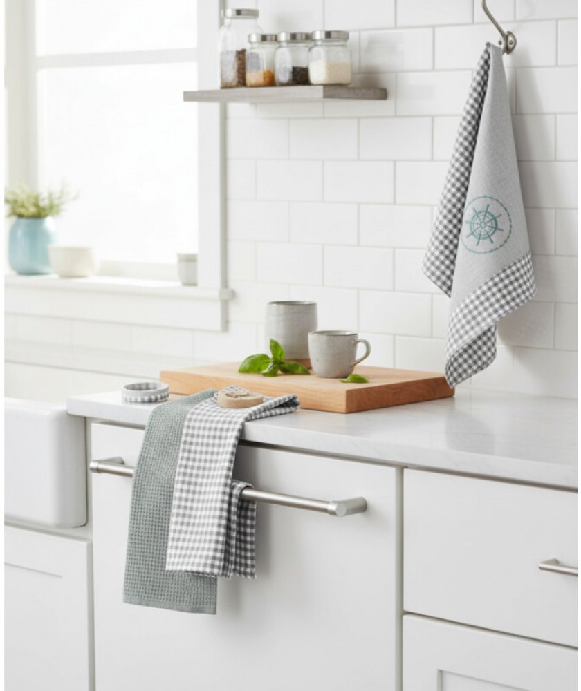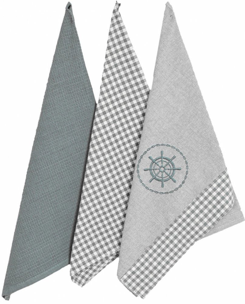 Sada tří kuchyňských utěrek Káro a kruh šedá spojuje moderní design s praktickou funkčností. Set obsahuje jednu tmavě šedozelenou utěrku se strukturovaným povrchem, jednu utěrku s drobným šedobílým káro vzorem a jednu světle šedou utěrku s elegantní výšivkou kormidla doplněnou káro lemem. Díky nadčasovému šedému ladění se hodí do většiny kuchyní.