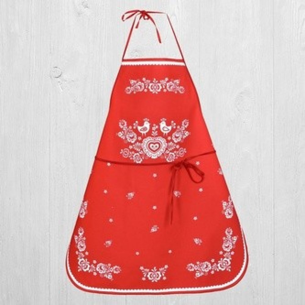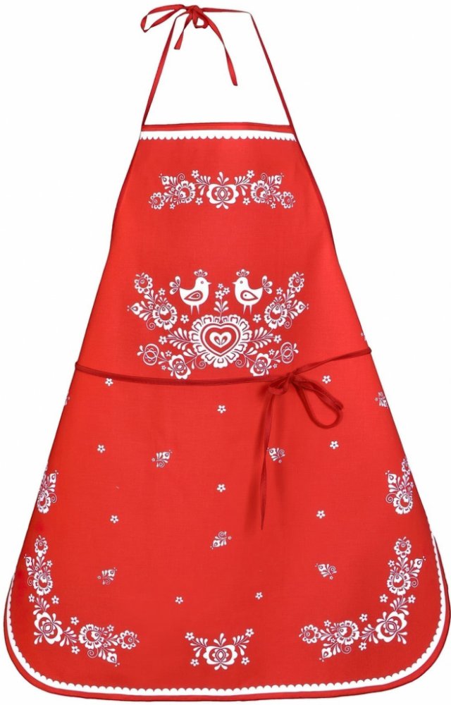 Název: Kuchyňská zástěra Folk podklad červený.