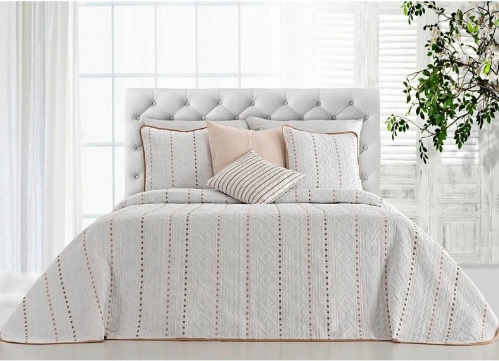 Nabízíme elegantní přehoz Riva na postel ve smetanově bílé barvě, zdobený puntíkovým vzorem. Tento přehoz je vkusným prvkem v interiérovém designu, vyrobený z kvalitního úpletového textilu pro vaši ložnici.