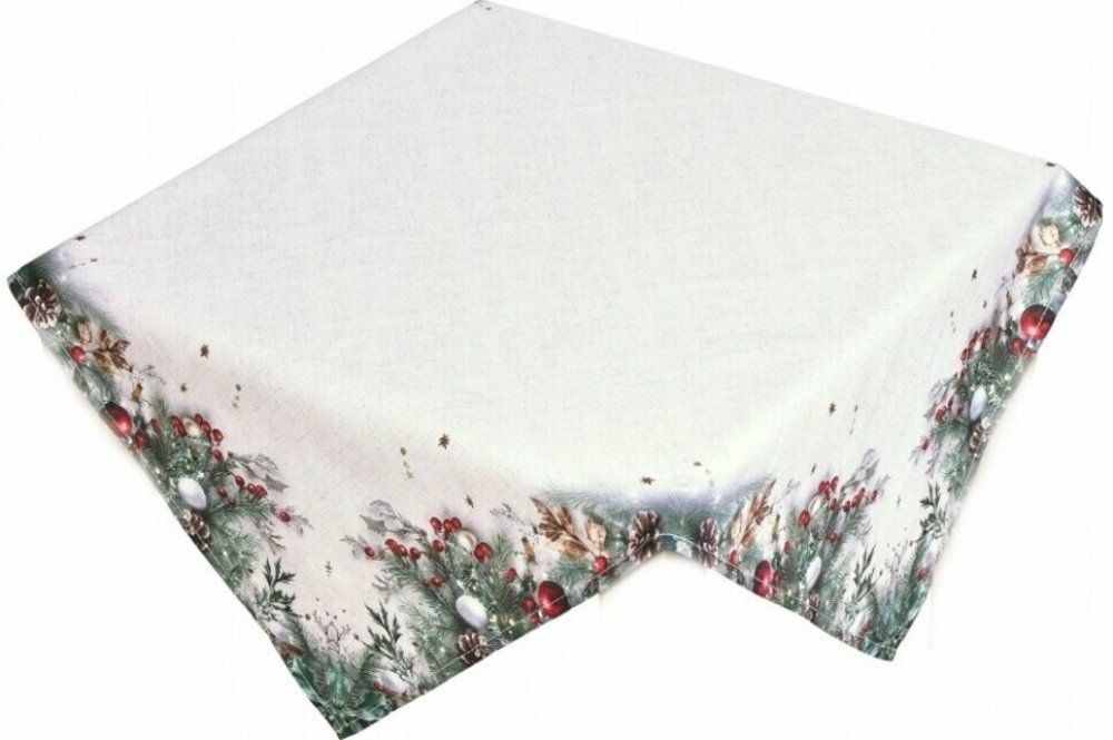 Elegantní vánoční ubrus s motivem cesmíny a ozdob dodá vašemu stolu slavnostní atmosféru. Ideální pro zimní dekoraci jídelny, kuchyně nebo obývacího pokoje.