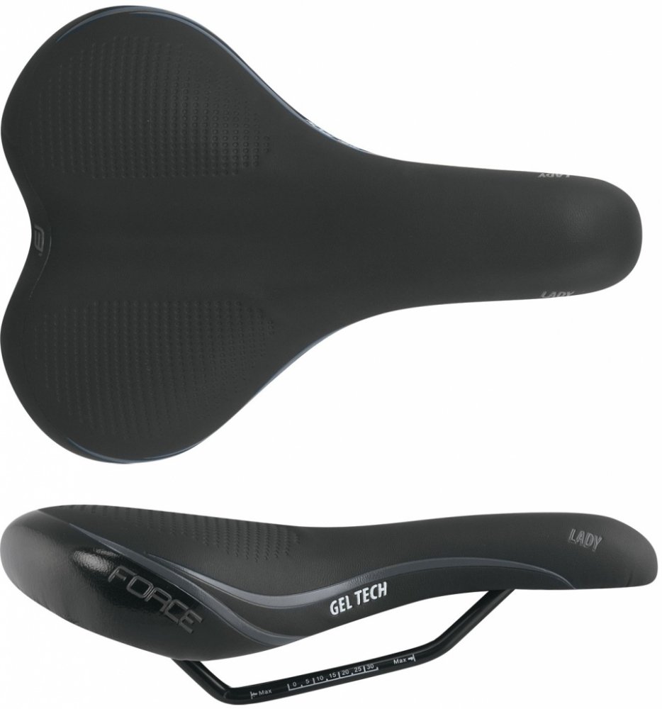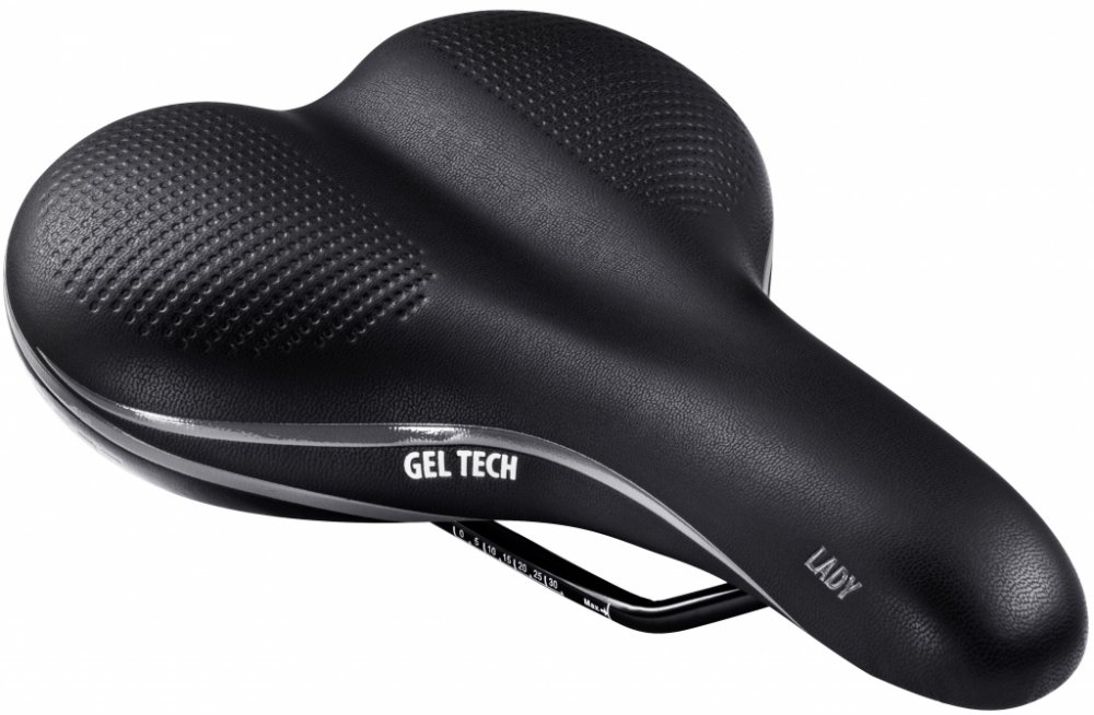 Komfortní a měkké gelové širší dámské sedlo vhodné například na cykloturistiku a na městská kola. Disponuje silnější gelovou vrstvou polstrování na kompozitovo-pryžové konstrukci a podélným středovým vybráním pro snížení tlaku v citlivých místech pro zlepšení jízdního komfortu.