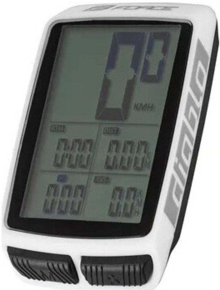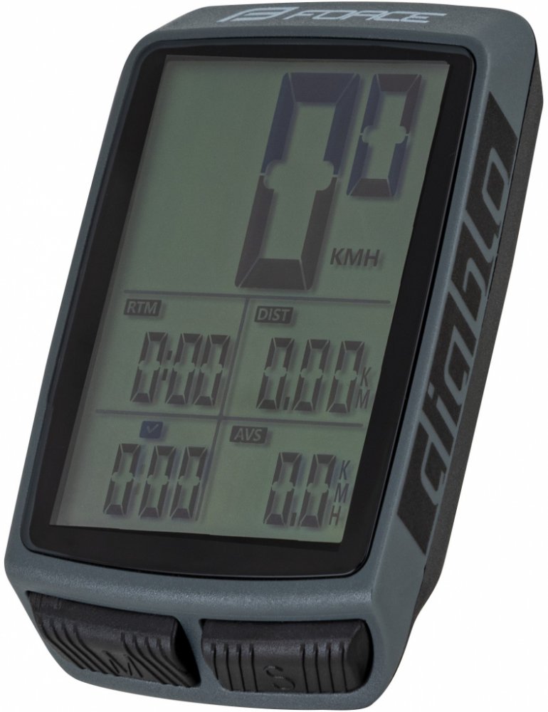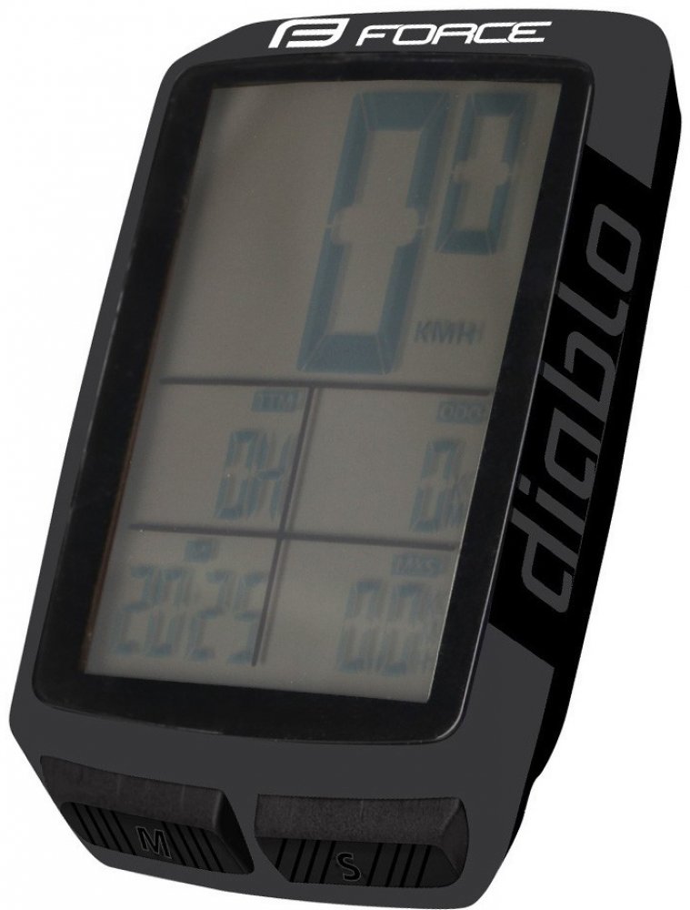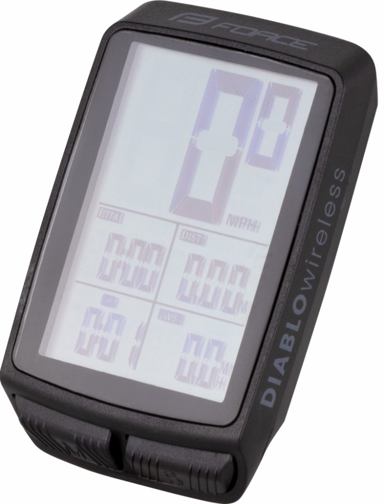 Bezdrátový cyklistický počítač FORCE DIABLO je ideální volbou pro cyklisty, kteří potřebují bezdrátový, kompaktní a spolehlivý nástroj pro sledování svého cyklistického výkonu. Díky rozsáhlé sadě funkcí, voděodolnému provedení a snadno instalovatelnému držáku je tento počítač ideální jak pro všechny typy jezdců.bezdrátové provedení, voděodolnýstupeň voděodolnosti IPX6: chráněno proti intenzivně tryskající voděvoda míří 12,5 mm tryskou ve všech úhlech při průtoku 100 litrů za minutu při tlaku 100 kN/m2 po dobu nejméně 3 minuty ze vzdálenosti 3 metryvčetně mincové baterie CR2032držák na řídítka/představec11 funkcí: denní vzdálenost, celková vdálenost, aktuální rychlost, průměrná rychlost, max. rychlost,denní doba jízdy, celková doba jízdy, hodiny, porovnání aktuální vůči průměrné rychlosti, auto ON/ OFF funkce, podsvícený displejmožnost nastavení jednotek km/mílejazyk počítače ENGvhodné pro všechny velikosti kolvelikost: délka 68 mm, šířka 44 mm, výška: 12 mmhmotnost včetně držáku a baterií: 33 gbaleno v krabičce FORCE s návodem