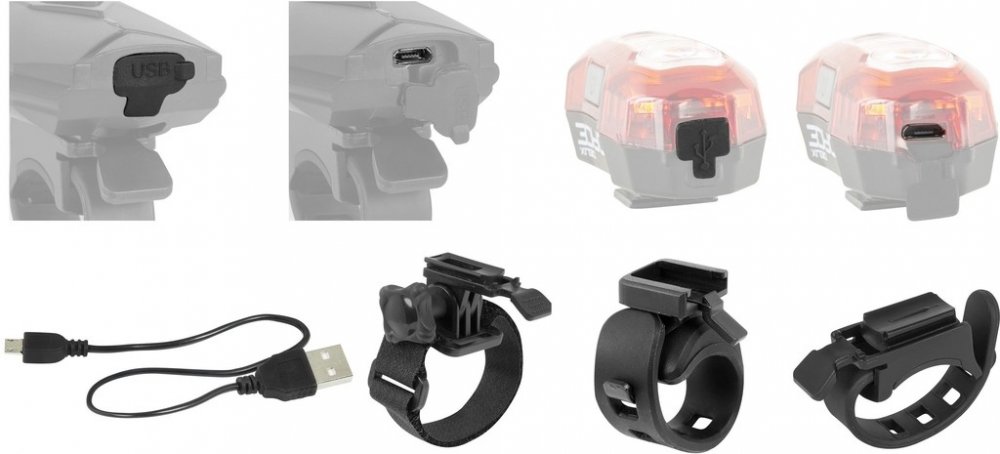 Sada obsahuje výkonnou USB dobíjecí přední svítilnu „Cass“ vybavenou vysoce svítivou LED Cree XP-G2 se širokým a jasným kuželem světla se třemi funkcemi svícení a blikání a taktéž dobíjecí zadní blikačku „Deux“ velmi dobře viditelnou i na velkou vzdálenost. Součástí balení jsou držáky na řídítka, sedlovku a na přilbu a také dobíjecí USB kabel.