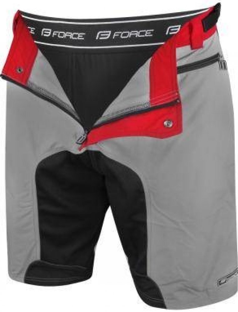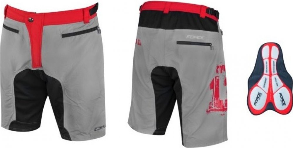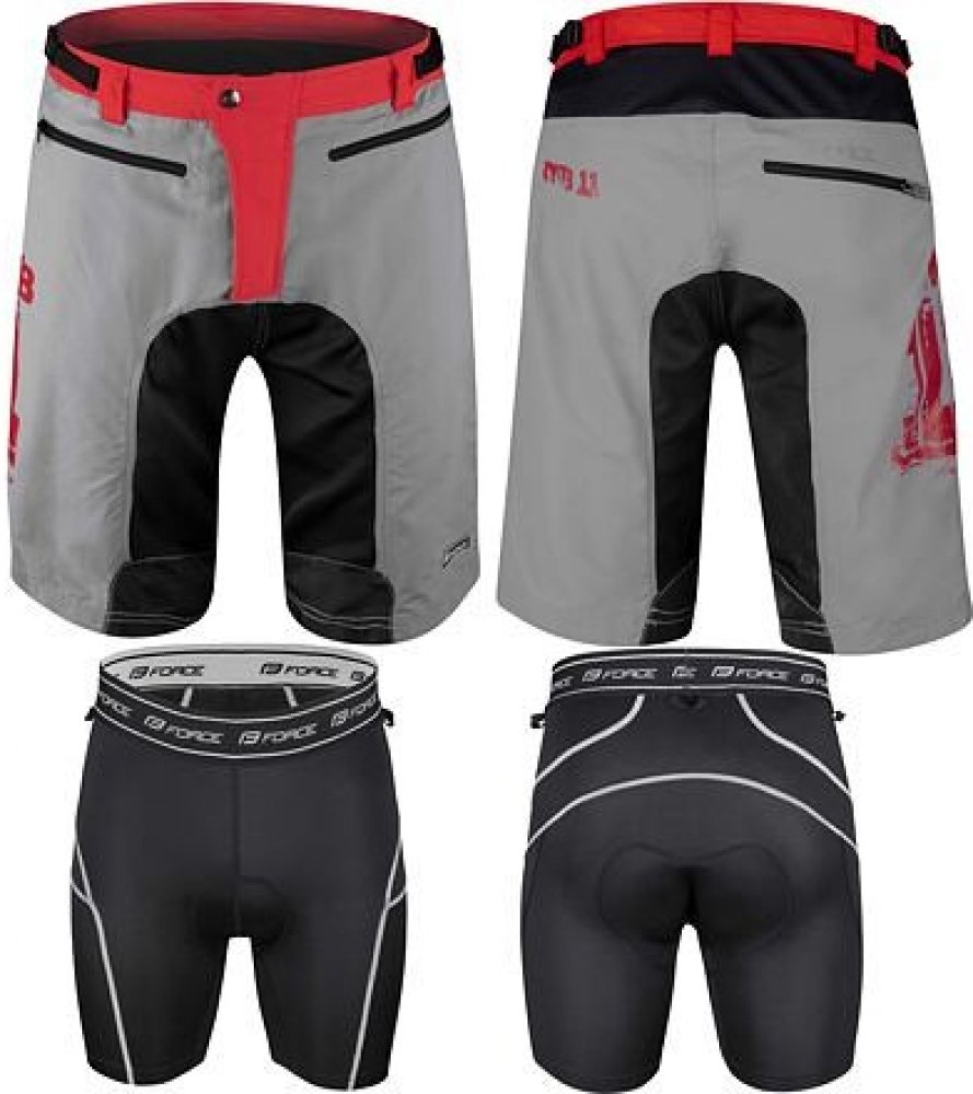 Volné cyklistické kalhoty FORCE MTB-11 odnímatelnými vnitřními kraťasy s gelovou vložkou, připnutí na suchý zip.