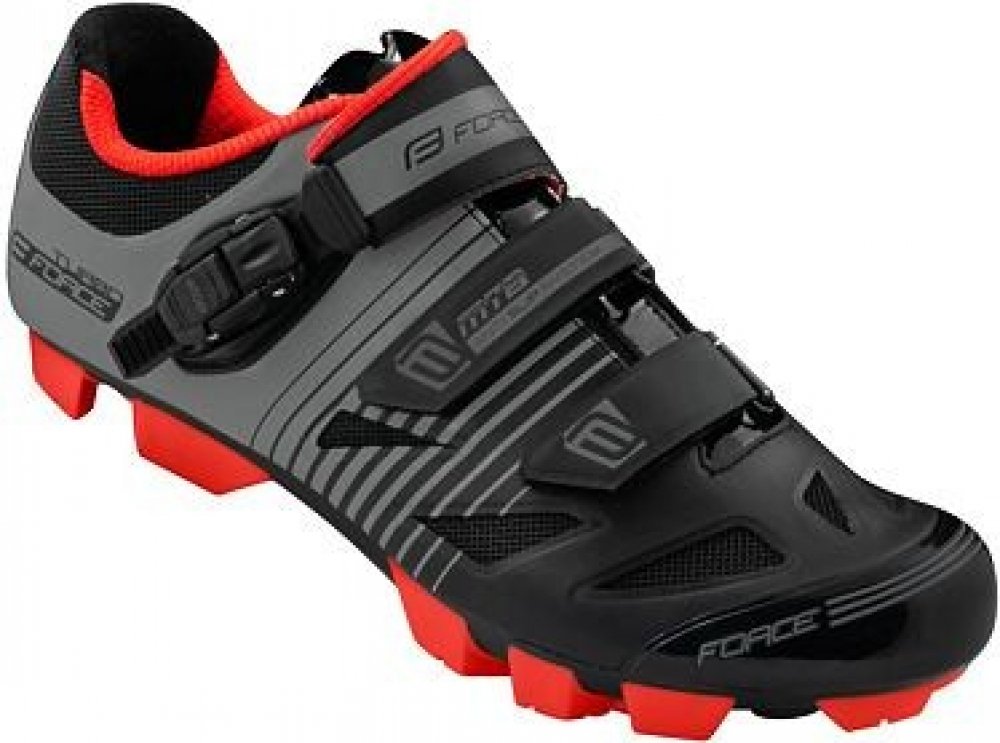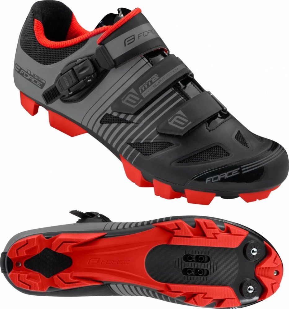 Horské tretry na kolo Force MTB Turbo. S podrážkou z nylonového kompozitu s indexem tuhosti 6, anatomickou vložkou a zapínáním na přezku Atop a dva suché zipy. Tretry jsou klasicky kompatibilní se systémem SPD. Velikosti odpovídají standardu civilní obuvi. V balení jsou také 4 hroty s klíčem.
