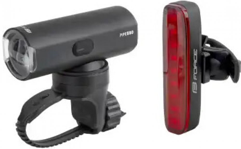Univerzální sada světel Force s výkonem 500/50 lumenů (přední/zadní) pro montáž na kolo bez potčeby nářadí Technické parametry: světlo přední FORCE PIPE 550LM USB (art. 451761) 5 funkcí: 4 funkce svícení + 1 funkce blikání univerzální elastický plastový držák na řídítka 22,2 - 35mm umožňuje upnutí i na zploštělá řídítka, je kompatibilní s držáky GARMIN součástí je i držák pro GOPRO Mount (pod držák počítače) baterie: integrovaná 18350 Li-ion 1100mAh, nabíjení přes USB-C výdrž: 1-7h (dle zvoleného režimu) včetně ukazatele indikace stavu baterie, doba dobíjení: 2h velikost: délka: 74mm, průměr: 29mm hmostnost včetně držáku: 88g, materiál: hliník blikačka zadní FORCE PIPE 50LM USB 9 x červená výkonná SMD LED 50LM 7 funkcí: 2 funkce svícení, 5 funkce blikání dva druhy držáku (1xUNI elastický silikonový držák na sedlovku + 1x držák pod sedlo) baterie: integrovaná Li-pol 400mAh, nabíjení přes USB-C výdrž baterie: 2,5-16h (dle zvoleného režimu) včetně ukazatele indikace stavu baterie, doba dobíjení: 1h velikost: délka: 80mm, šířka: 20mm, výška: 17mm stupeň voděodolnosti: IP65 proti tryskající vodě - voda míří na zařízení tryskou o průměru 6,3 mm ve všech úhlech při průtoku 12,5 litrů za minutu při tlaku 30 kN/m2 po dobu nejméně 3 minuty ze vzdálenosti 3 metry hmotnost včetně držáku: 30 g, materiál: hliník baleno v krabičce FORCE