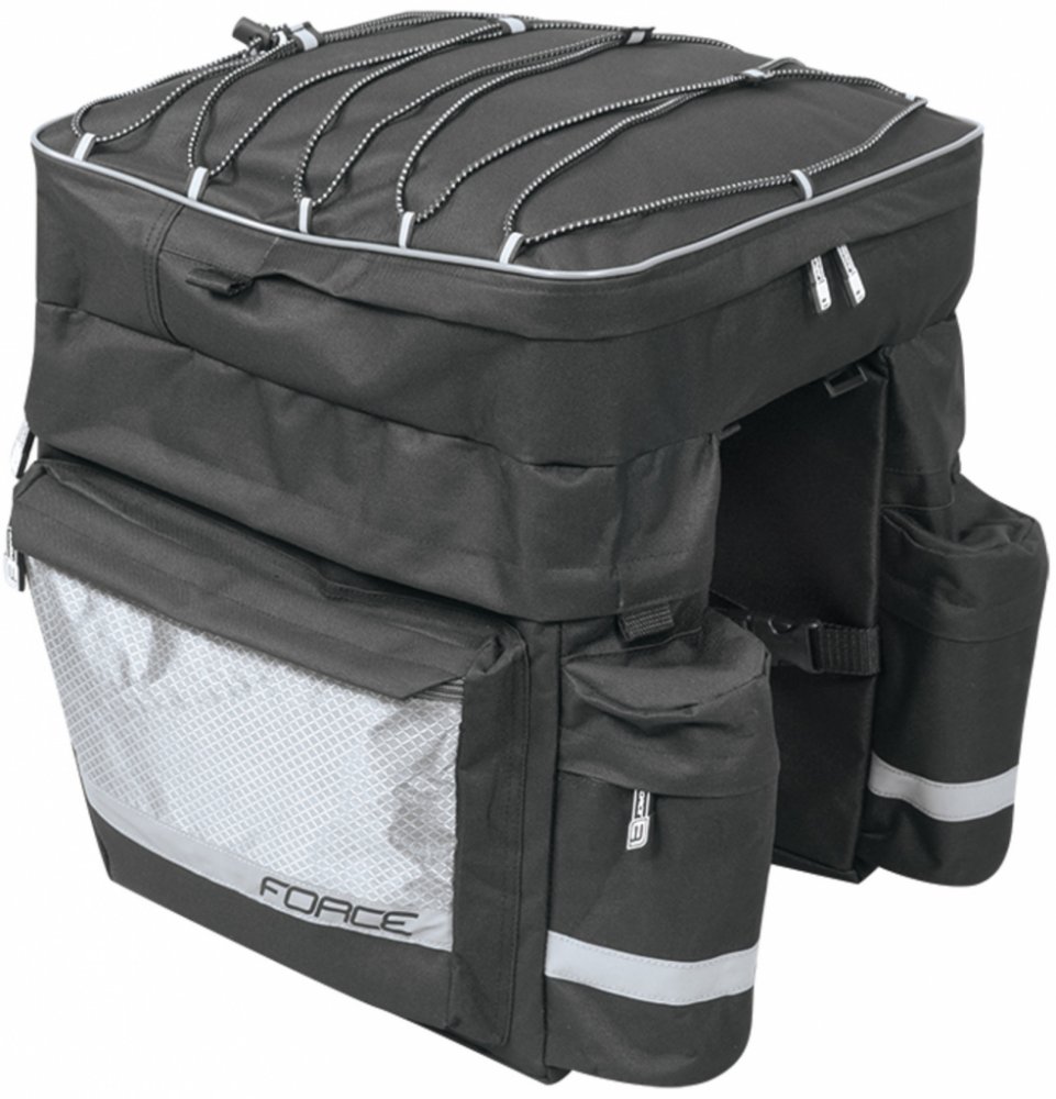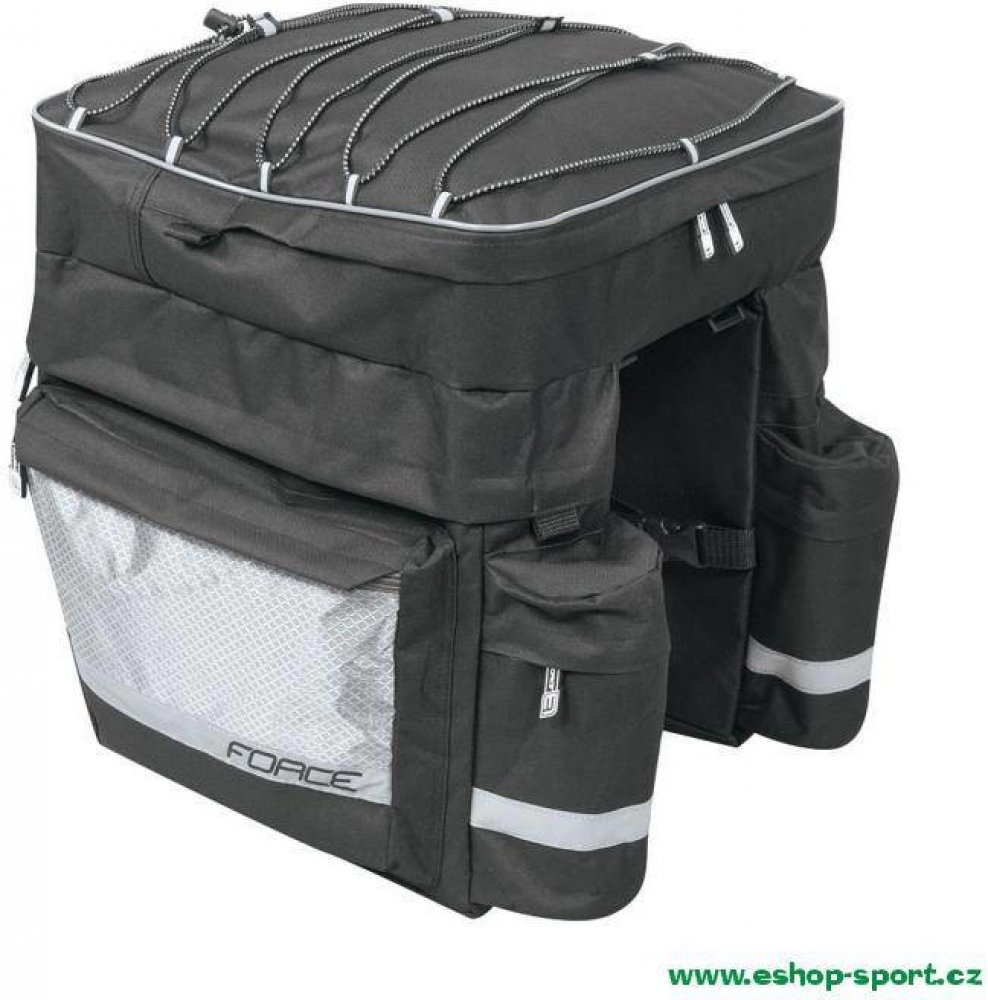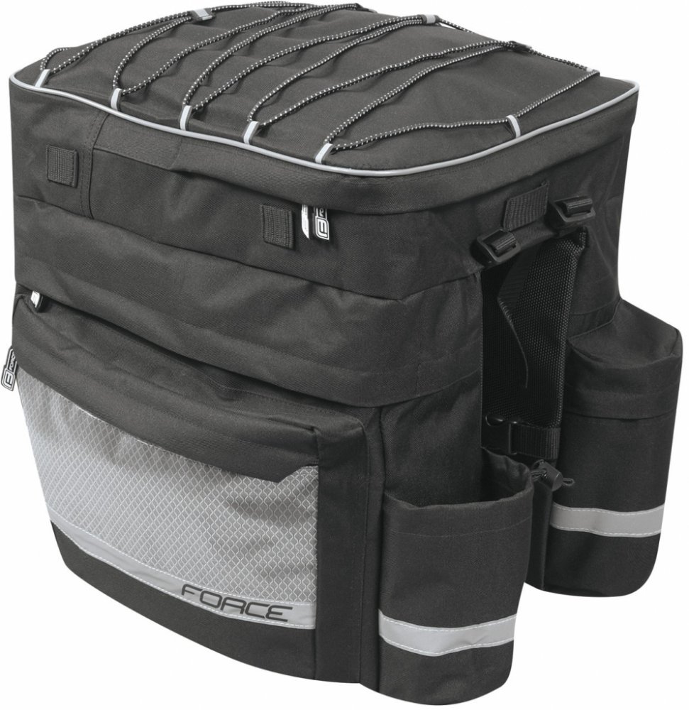 Brašna-trojbrašna zadní FORCE TARGET černá 32 l je ideální pro všechny cyklisty na delší výlety. Snadno se připevňuje i odepíná. Velký počet kapes jistě oceníte. Prostor pro všechno potřebnéBrašna má velký úložný prostor (32 l), do kterého dáte vše, co potřebujete mít na cyklovýletě po ruce. Disponuje čtyřmi postranními kapsami na zip, dvěma kapsami na zip v horní části a dvěma kapsami na bocích. Lehká brašna pro vaše bezpečíPrázdná brašna váží pouhých 1530 gramů, takže vás při jízdě nijak nebude omezovat. Po naplnění může mít však až 15 kg. Pro vaše bezpečí ji výrobce vybavil i reflexními prvky. Materiál, který vydržíBrašna je vyrobena z odolného materiálu, který vydrží i nepříznivé počasí. Nemusíte se tak bát, že se poničí. I po několika sezónách bude vypadat pořád skvěle.Snadné připevněníPřichycení přes popruhy na zadní nosič je tak snadné, že to zvládne i méně zručný cyklista. Stejně tak jednoduše se taška i odjímá.