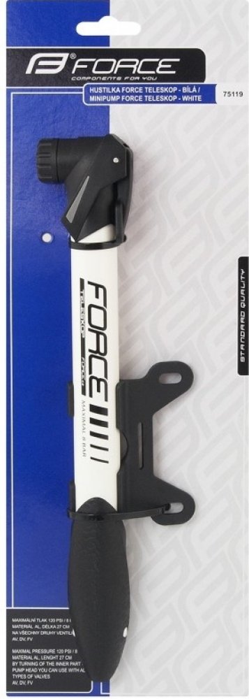 Pořádně dlouhá hustilka Force teleskop. 27 centimetrů je více než evropský standart. Touto hustilkou nafoukneš kolo co by dup a můžeš pokračovat po toulkách modrou planetou. DUOPÍST na všechny druhy ventilků (AV - moto, FV - galuskový, DV - klasický)