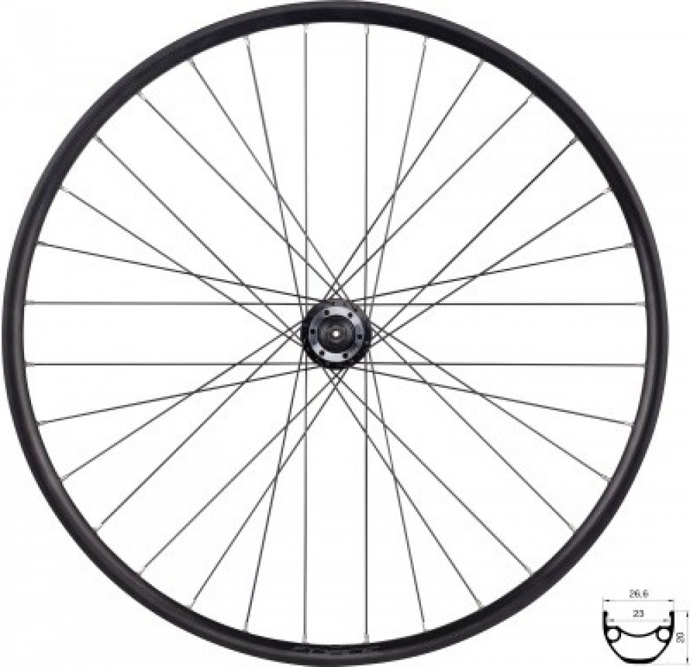 FORCE XC Disc 622x23/ přední náboj Force F804332 pro kotouč 6 děr 28/29" přední zapletené kolo pro 29" mtb kola či krosová kola s kotoučovými brzdami. Specifikace: Přední duralový náboj FORCE F804332 je v provedení s rychloupínákem QR - kuličková ložiska - osa: 9 x 108 x 100 mm, 32 děr - upevnění brzd.kotouče na náboj : 6-děr D voustěnný černý ráfek /jednoduchý nýt - materiál ráfku: Al hliník 6005 T6, černý elox - vnitřní šířka ráfku 23mm Parametry : - rozměr : 622x23 mm - černé paprsky nerez - 32 děr - výška ráfku : 20 mm - otvor pro ventilek : 8,5 mm - hmotnost kola : 1100 gr včetně rychloupínáku - maximální váha jezdce: 130 kg - art.Nr.: 7025973 - kotouč není součástí balení - barva : černá matná