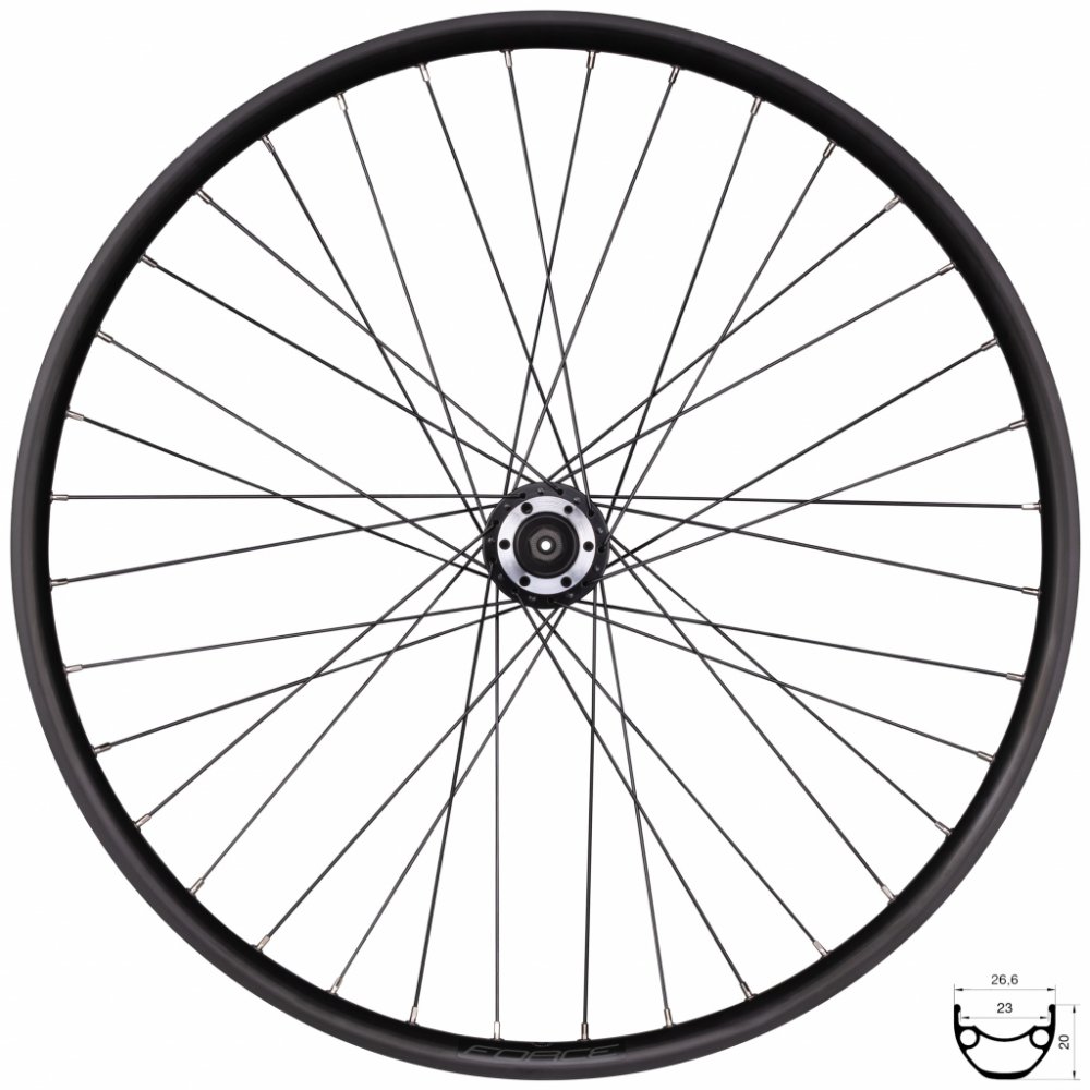 náboj FORCE 804336 pro 6 děrové brzdové kotoučekuličková ložiska, osa: 9 x 108 x 100 mm, včetně rychloupínákuráfek 26" FORCE XC DISC 559x23, tubeless ready36 děr, jednoduché nýtyvýška ráfku: 20 mm, otvor pro ventilek: 8,5 mmmateriál ráfku: Al hliník, černýmateriál drátů: nerez, černéhmotnost: 1 065 g včetně rychloupínáku