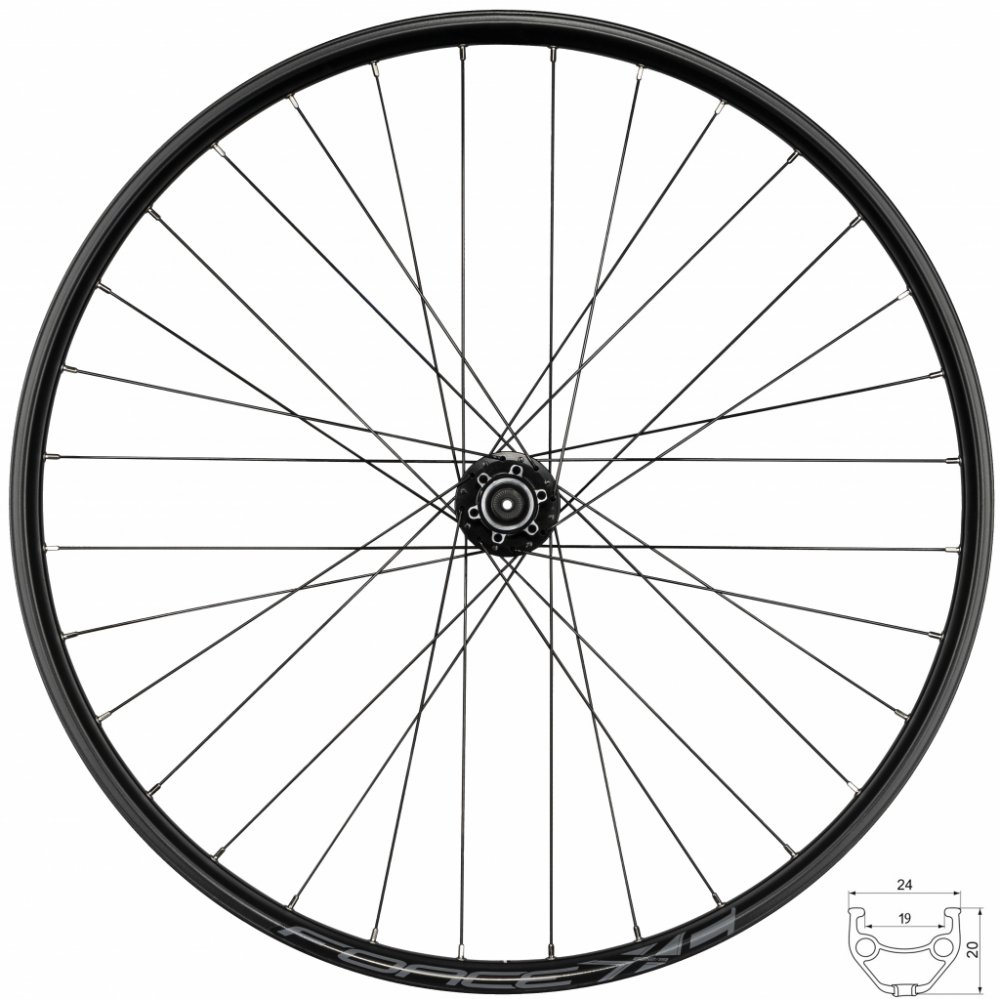 náboj FORCE 804342 pro 6 děrové brzdové kotouče průmyslová ložiska, osa: 3/8" x 108 x 100 mm, včetně rychloupínáku ráfek 29" FORCE XC DISC 622x23, tubeless ready 32 děr, jednoduché nýty výška ráfku: 20 mm, otvor pro ventilek: 8,5 mm materiál ráfku: Al hliník, černý materiál drátů: nerez, černé hmotnost: 1 124 g včetně rychloupínáku