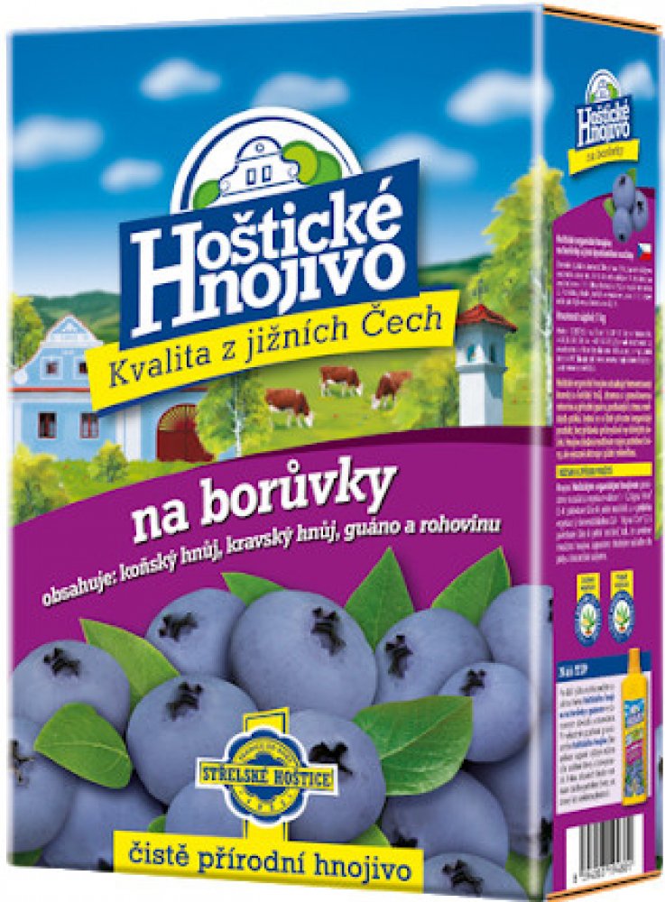 Hoštické organické hnojivo na borůvky obsahuje fermentovaný kravský a koňský hnůj, drcenou a granulovanou rohovinu a přírodní guáno, pocházející z trusu mořských ptáků. Jedná se o čistě přírodní produkt, bez přídavku průmyslově vyráběných složek. Hnojivo dodává nejen potřebné živiny, ale výrazně aktivuje i půdní mikroflóru.